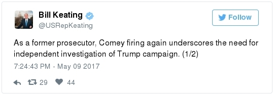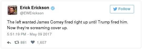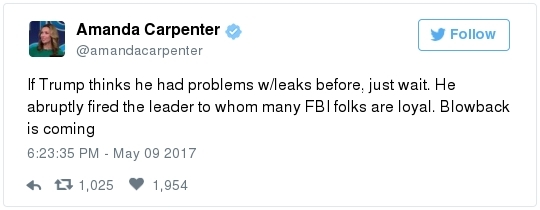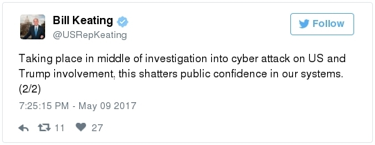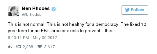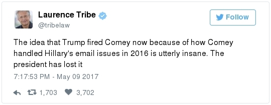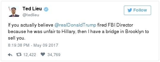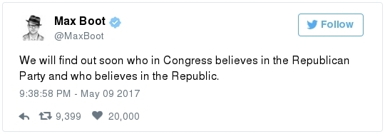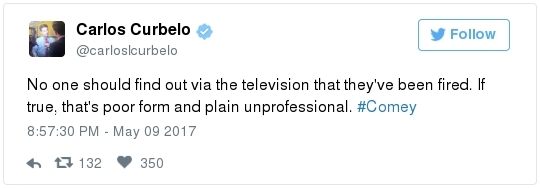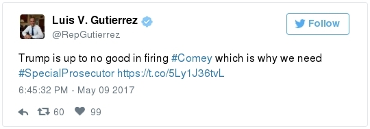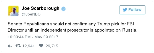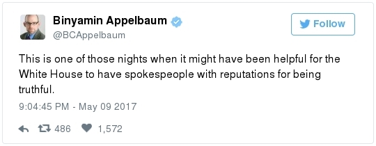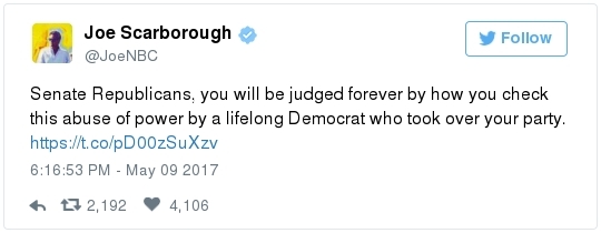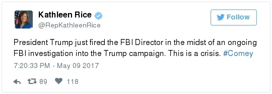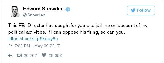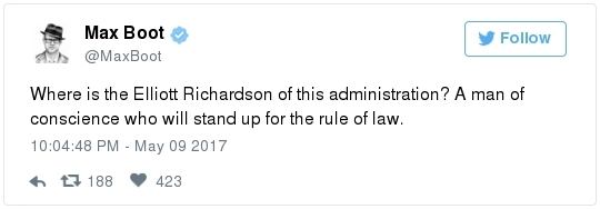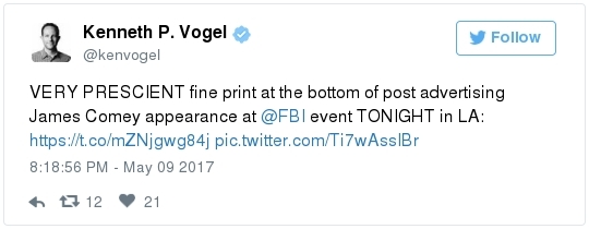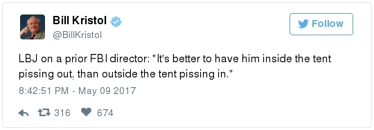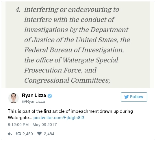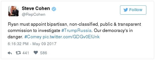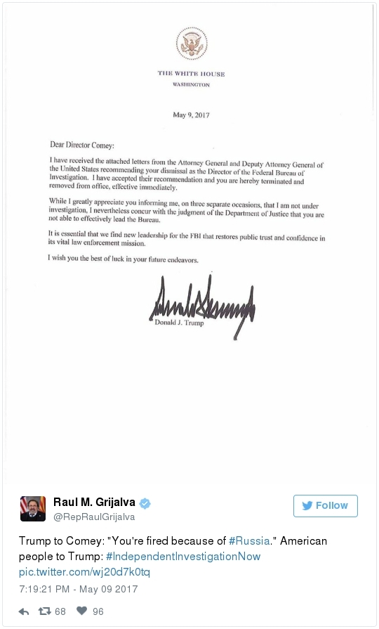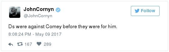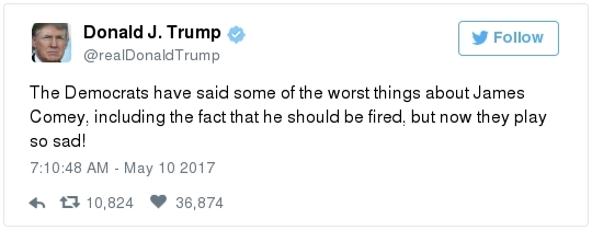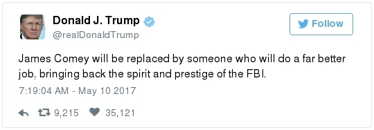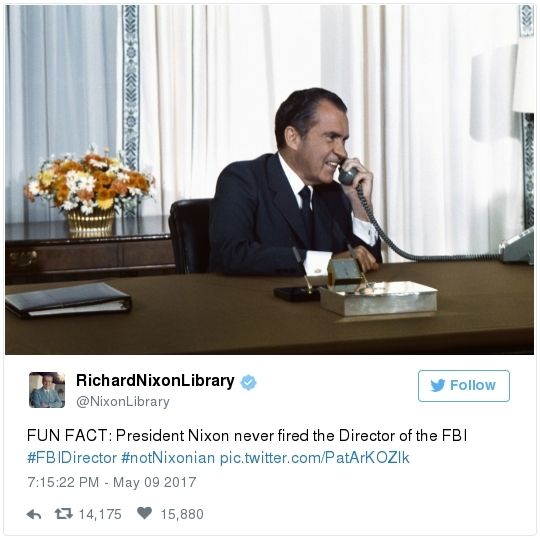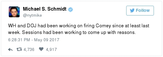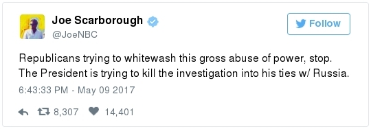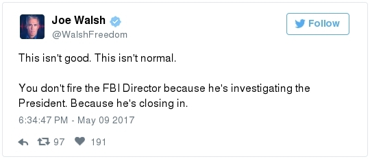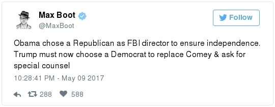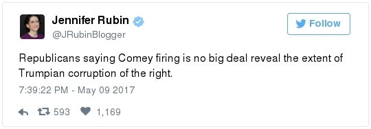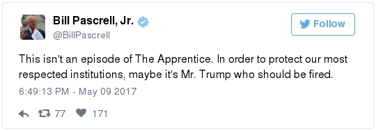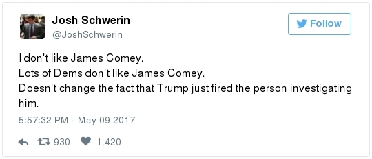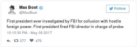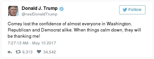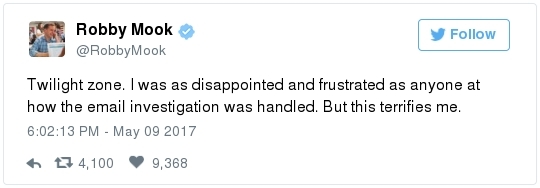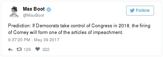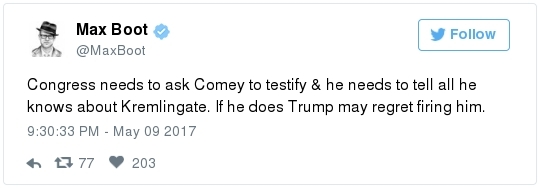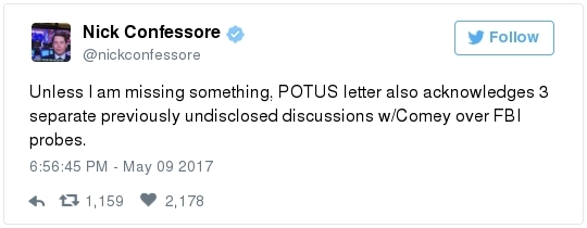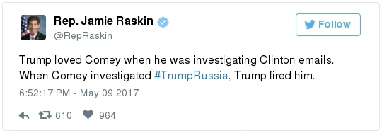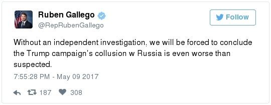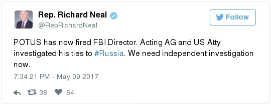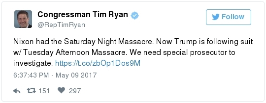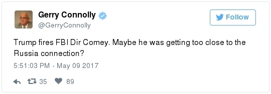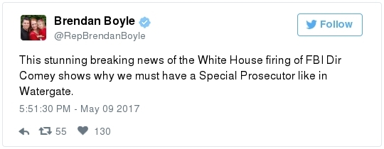 -- Lt. Gov. Ralph Northam and former congressman Tom Perriello delivered some of their harshest rhetoric yet about Trump during a Democratic gubernatorial debate last night, competing to see who could condemn the president more harshly. Gregory S. Schneider reports: "The consensus marked a generally civil debate - perhaps surprisingly so, given how harshly staffers from the rival Democratic campaigns have been sniping at one another all week following a more acrimonious debate last week in Roanoke.There were only two clear moments of attack: Perriello, as he has before, jabbed Northam for having admitted that he voted twice for George W. Bush for president, before Northam became involved in politics. Northam had a response ready. 'You know in 2009 Mr. Perriello made a statement that he was really a libertarian at heart and the only reason that he switched to being a Democrat was that he could run for Congress,' [he said] … But otherwise, Northam and Perriello had seemed like they could be friends, if only they didn't have to occasionally attack one another. Northam seemed jaunty, at one point joking that he thought a compliment from Perriello was actually an attack, then jumping back and slapping his hands like an uncle who just made a corny joke." A GLOBAL TREND TO WATCH: -- "A new political opposition in France — people who don't vote," by Isaac Stanley-Becker: "The new opposition. That's how Emilia Julie, a literature student in the populous French capital that helped hand Emmanuel Macron the presidency Sunday, christened the roughly 15.5 million renegades who abstained or voided their ballots. The number amounts to a third of registered voters — staggering by French standards — who wanted no part in choosing between Macron … and [far-right National Front leader] Marine Le Pen … More people abstained than voted for Le Pen, who won about 10.6 million votes, her party's best performance in a presidential election. The number of blank and voided ballots was a record for France's Fifth Republic, founded in 1958. 'I choose not to enter the game," said Julie, 18, who stayed home Sunday to signal her disagreement with both candidates and to deny Macron a mandate. The right to vote, she said, is important. "But it's more important to vote for someone you actually want to be in office. [Experts] called the historic nonparticipation rate a testament to deepening polarization and a sign of the tough road ahead for Macron, as he prepares for parliamentary elections in June that will decide whether he can govern with a legislative majority." SOCIAL MEDIA SPEED READ: Here is some additional reaction to the Comey news-- From a Post reporter: Notable: New York Times reporters: Politico: Harvard Law Professor: The decision created some strange bedfellows: Nixon prepared to fire J. Edgar Hoover, but he chickened out at the last minute because he was afraid of what dirt the longtime FBI director might have on him: From a New Yorker writer: Lots of reaction from Clinton alumni (Abby Phillip has a fuller round-up): Obama alumni: Some Republicans called out Dems for slamming Comey, until he was gone: Schumer's communications director fired back: Here's the flip side. From Ted Cruz's former communications director: A former Republican member of Congress from Illinois: The conservative Weekly Standard editor: Finally, a little bit of comic relief: From InfoWars, the peddler of conspiracy theories: How Obama dressed in Italy: Flashback:  | | HOT ON THE LEFT: "Wisconsin's Voter-ID Law Suppressed 200,000 Votes in 2016 (Trump Won by 22,748)," from The Nation: "According to federal court records, 300,000 registered voters, 9 percent of the electorate, lacked strict forms of voter ID in Wisconsin. A new study by Priorities USA … shows that strict voter-ID laws, in Wisconsin and other states, led to a significant reduction in voter turnout in 2016, with a disproportionate impact on African-American and Democratic-leaning voters. Wisconsin's voter-ID law reduced turnout by 200,000 votes, according to the new analysis. [Trump] won the state by only 22,748 votes. The study compared turnout in states that adopted strict voter-ID laws between 2012 and 2016, like Wisconsin, to states that did not. This reduction in turnout particularly hurt Hillary Clinton's campaign … In Mississippi, Virginia, and Wisconsin, strict voter-ID laws had an especially pronounced negative impact on African-American voters. [The study] … is consistent with a 2014 study by the [GAO], which found that strict voter-ID laws in Kansas and Tennessee reduced turnout by 2 percent, enough to swing a close election, with the largest drop-off among newly registered voters, young voters, and voters of color." | | HOT ON THE RIGHT: "Death of Bearing Arms editor and gun-rights advocate Bob Owens has been ruled a suicide," from Kristine Phillips: "Bob Owens, editor of the popular pro-gun blog BearingArms.com, died Monday in what authorities have ruled a suicide. Officials say Owens shot himself in the head near his North Carolina home. A gun was located nearby, according to the Fuquay-Varina Police Department." Posts about Owens, a shooting enthusiast and a well-known Second Amendment advocate, have flooded social media, with his co-editor describing him as a "a huge part of the 2A world," but "first and foremost a son, brother, husband, father, and a friend." "In 2013, Townhall, a conservative media site that owns Bearing Arms, hired Owens to be the blog's editor. Owens was a certified firearms instructor with roughly 400 hours of professional training class, according to a brief biography on the site … In one of his last articles for the site, Owens wrote about what it was like to be a firearms instructor." | DAYBOOK: At the White House: Trump will meet with Lavrov. This afternoon, Mike Pence will participate in an economic lunch. | QUOTE OF THE DAY: "I've never really stood in front of a crowd and talked to them about 'the gay.' But I'