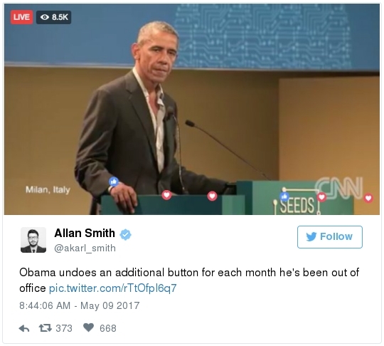- Former President Obama made his first public appearance overseas since leaving office, telling attendees at a food and technology conference in Milan that he is "confident" the U.S. will continue to move in "the right direction" on climate change. (AP)