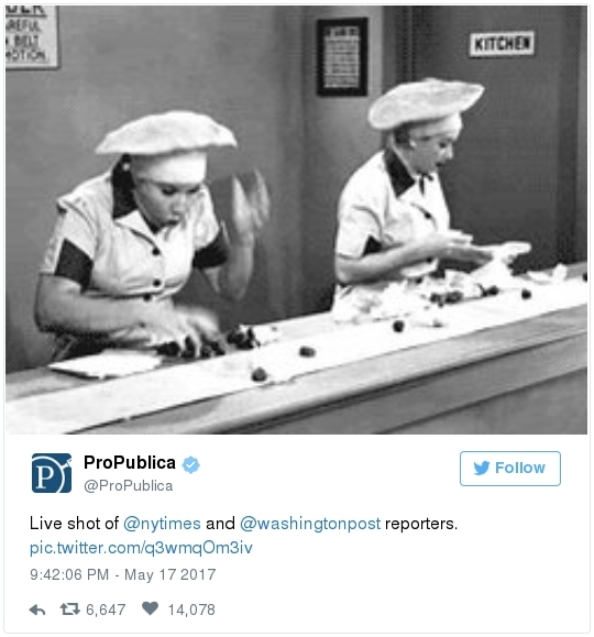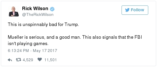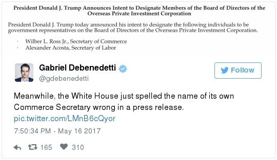 DECONSTRUCTING THE ADMINISTRATIVE STATE: -- The Labor Department yesterday suspended an Obama-era disclosure rule requiring companies to electronically report injury and illness records -- a move that effectively keeps these records from being publicly disclosed for the immediate future. Juliet Eilperin reports: "[Previously] OSHA had required about 180,000 establishments in high-hazard industries such as manufacturing and nursing homes to submit the summary data by mail. But the program cost $2 million a year to run, and officials decided to expand the requirement and transition it to an electronic system instead. The rule, which covered nearly 441,000 workplaces, took effect Jan. 1 and employers were obligated to send in their summary data by July 1. But OSHA never launched the website for companies to submit the information, and it posted language Wednesday with an existing fact sheet saying it "is not accepting electronic submissions of injury and illness logs at this time, and intends to propose extending the July 1, 2017 date by which certain employers are required to submit the information.'" -- Federal regulators are moving to roll back one of the Obama administration's "net neutrality" rules this week, launching a new push to repeal a set of regulations guiding how Internet providers may treat websites and their customers. Brian Fung reports: "The vote on Thursday, led by Federal Communications Commission Chairman Ajit Pai, will kick off consideration of a proposal to relax regulations on companies such as Comcast and AT&T. If approved by the 2-1 Republican-majority commission, it will be a significant step for the broadband industry as it seeks more leeway under government rules to develop new business models. [But] for consumer advocates and tech companies, it will be a setback; those groups argue that looser regulations won't prevent those business models from harming Internet users and website owners."  Trump arrives at Mar-a-Lago. (Meghan Mccarthy/Palm Beach Daily News) TRUMP'S CARELESSNESS ON SECURITY: -- ProPublica and Gizmodo --> "Any Half-Decent Hacker Could Break Into Mar-a-Lago," by Jeff Larson, Surya Mattu, and Julia Angwin: "Two weeks ago, on a sparkling spring morning, we went trawling along Florida's coastal waterway. But not for fish. We parked a 17-foot motor boat in a lagoon about 800 feet from the back lawn of The Mar-a-Lago Club in Palm Beach and pointed a 2-foot wireless antenna that resembled a potato gun toward the club. Within a minute, we spotted three weakly encrypted Wi-Fi networks. We could have hacked them in less than five minutes, but we refrained. A few days later, we drove through the grounds of the Trump National Golf Club in Bedminster, New Jersey, with the same antenna and aimed it at the clubhouse. We identified two open Wi-Fi networks that anyone could join without a password. We resisted the temptation. We have also visited two of [Trump's] other family-run retreats [in Washington] and Sterling, Virginia. Our inspections found weak and open Wi-Fi networks, wireless printers without passwords, servers with outdated and vulnerable software, and unencrypted login pages to back-end databases containing sensitive information. "The risks posed by the lax security, experts say, go well beyond simple digital snooping. Sophisticated attackers could take advantage of vulnerabilities in the Wi-Fi networks to take over devices like computers or smart phones and use them to record conversations involving anyone on the premises. 'Those networks all have to be crawling with foreign intruders, not just ProPublica," said [cyber-security expert] Dave Aitel … when we told him what we found.  Donald Trump Jr. walks from the elevator at Trump Tower. (Carolyn Kaster/AP) CONFLICTS OF INTEREST WATCH: -- "Donald Trump Jr. traveled to Dubai and met a billionaire business partner in the city-state, discussing 'new ideas' as the Emirati's real estate firm still lists possible plans for future joint projects while Trump's father is in the White House," the Associated Press's Jon Gambrell reports: "The Trump Organization has said it won't make new foreign deals while Donald Trump serves as America's 45th president. That didn't affect the Trump International Golf Club in Dubai's opening in February, while a previously planned Trump-branded golf course designed by Tiger Woods is still being built nearby. Both projects are being built by Dubai's DAMAC Properties, owned by Emirati billionaire Hussain Sajwani. His company has paid the Trump Organization's subsidiaries between $1 million to $5 million for the projects." -- "Ivanka Trump's apparel brand is facing criticism from a labor-rights group for relying on Chinese factories that it says force some employees to work long shifts at the equivalent of about a dollar an hour," Bloomberg's Stephanie Hoi-Nga Wong reports: "The nonprofit organization China Labor Watch said it investigated two Chinese factories that produce goods for Ivanka Trump's brand. It then shared its findings in a letter sent to the first daughter, saying employees are forced to work at least 12 1/2 hours a day and at least six days a week -- at a monthly salary of about 2,500 yuan ($363). China Labor Watch said it has yet to receive a response."  -- The Energy 202 debuts on Tuesday. Dino Grandoni will bring you the latest in energy and environmental developments on Capitol Hill, the White House, the Energy Department and the Environmental Protection Agency. Get your daily charge here. SOCIAL MEDIA SPEED READ: This pretty much sums up the feeling on Capitol Hill right now: Somehow mistakes like this slip through the White House press office every day. Professional communicators from both parties are baffled. What is their approval process? Good reviews on Mueller came pouring in -- From two respected national security journalists: From the GOP chairman of the House Oversight Committee: The Democratic senator from Wisconsin: Other Democrats said the spec