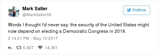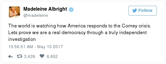| | Shouts, jeers at Rep. Brat town hall | -- "Hundreds of people booed, shouted and laughed derisively at Rep. Dave Brat (R-Va.) at his first town hall meeting since he voted with other House Republicans to dismantle parts of the Affordable Care Act," Laura Vozzella reports: "'Everybody asks for town halls so we can have civil discourse,' a frustrated Brat told more than 700 people at a suburban Richmond church on Tuesday night. 'That's what I'm trying to do. If we go this route, it's going to be very hard to have rational civil discourse. I'm trying.' Trouble began even before Pastor Stan Grant of Clover Hill Assembly of God finished his invocation. As he prayed to God that the discussion would go forth 'in a way that will honor you,' a handful of Brat's critics stood holding small signs aloft. Nope,' 'Shame" and 'Stop using the Bible as a weapon,' they read. State Sen. Amanda F. Chase, who attends the church and helped organize the meeting, was heckled as she tried to introduce Brat. 'Ugh' someone yelled. 'You guys are a tough crowd," she said, before turning to Brat and pressing on. 'I've known you for about 10 years.' Then more heckling, and she gave up. 'Dave,' she said, 'they want to hear from you.' As the 90-minute meeting concluded, Brat's critics sang tauntingly at him, "Hey, hey, hey, goodbye." -- Texas Rep. Pete Sessions, whose father was the last FBI director ousted by a president, said Comey should have been allowed "to exit in a more gracious way." "I always favor dialogue over firing," Sessions told Dallas Morning News' Keven Ann Willey. "Sessions said the president, in a face-to-face meeting, should have given Comey the opportunity to step down. That would have avoided the issue of 'a firing.' That word, Sessions said, is 'a tag on a man who ... performed reasonably well and it got out of hand.' Sessions recounted that President Bill Clinton gave his father, William Sessions, the opportunity to resign in 1993 and his father chose not to … [Clinton was the first and only president to dismiss an FBI director until Trump's firing of Comey]. [Sessions] described Comey as generally a good FBI director who made some errors. He affirmed that Trump had the authority to fire Comey, may have even had cause to do so, but suggested that the president should have given Comey the courtesy of a conversation, a face-to-face meeting, with opportunity to resign first: "I think you treat good people better."  Natasha De Alencar clutches a flag that covered the coffin of her husband, who died in Afghanistan. (Michael Robinson Chavez/The Washington Post) WAPO HIGHLIGHTS: -- "Mourning a soldier whose death could mark a new stage in America's longest war," by Michael E. Miller: "They had followed him across the country and back, from one military base to another. On Wednesday, Army Staff Sgt. Mark De Alencar's wife and five children followed him one last time: six figures, dressed in black, walking behind the caisson that carried his casket through Arlington National Cemetery. De Alencar, 37, was killed April 8 when his Special Forces unit clashed with Islamic State fighters in eastern Afghanistan. He was the first American killed in combat in Afghanistan in more than four months. Now his death could mark the beginning of a new stage in America's longest war. Five days after he died, U.S. forces dropped a 22,000-pound explosive [near where De Alencar was shot] ... Since then, two more American soldiers have been killed fighting the Islamic State in the same area. De Alencar's burial comes as the Trump administration weighs a re-escalation of the war in Afghanistan, which has lasted more than 15 years." SOCIAL MEDIA SPEED READ: Trump tweeted this last night: Sen. Richard Blumenthal (D-Conn.), who Trump attacked on Twitter, responded yesterday: From Madeleine Albright: From a former top adviser to John McCain: The former Ohio secretary of state tweeted this: The news cycle keeps getting shorter and shorter: GOOD READS FROM ELSEWHERE: -- New York Times, "Hackers Came, but the French Were Prepared," by Adam Nossiter, David E. Sanger and Nicole Perlroth: "Everyone saw the hackers coming. The [NSA] in Washington picked up the signs. So did Emmanuel Macron's bare-bones technology team. And mindful of what happened in the American presidential campaign, the team created dozens of false email accounts, complete with phony documents, to confuse the attackers. The Russians, for their part, were rushed and a bit sloppy, leaving a trail of evidence that was not enough to prove for certain they were working for the government of [Putin] but which strongly suggested they were part of his broader 'information warfare' campaign. The story told by American officials, cyberexperts and Mr. Macron's own campaign aides of how a hacking attack intended to disrupt the most consequential election in France in decades ended up a dud was a useful reminder that as effective as cyberattacks can be in disabling Iranian nuclear plants, or Ukrainian power grids, they are no silver bullet. The kind of information warfare favored by Russia can be defeated by early warning and rapid exposure. But that outcome was hardly assured on Friday night, when what was described as a 'massive' hacking attack suddenly put Mr. Macron's electoral chances in jeopardy." | HOT ON THE LEFT: "White Cop Who Finds He Has African Ancestry Sues City, Chief Over Racism," from HuffPost: "Michigan police officer Cleon Brown is suing his chief and the city after a chain of events that began when he took a genetic test through Ancestry.com in December and was surprised to learn he could trace 18 percent of his DNA to regions in Africa. Brown was also surprised by how his fellow officers in the Hastings Police Department reacted to the news. He said the police chief called him 'Kunte,' after the character in Alex Haley's novel 'Roots: The Saga of an American Family,' while other officers whispered 'Black lives matter' when they walked past … Even the m