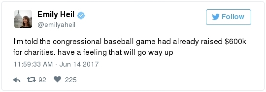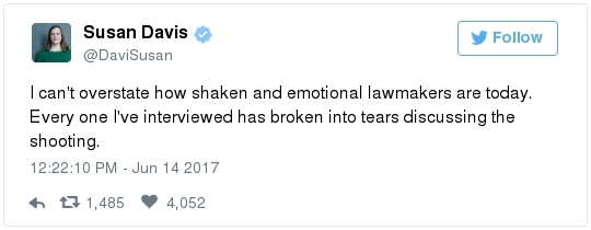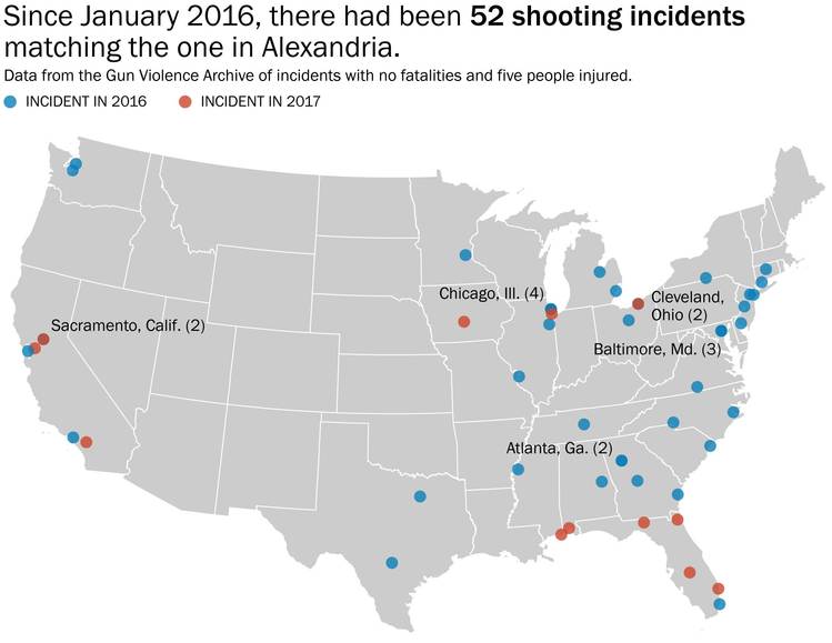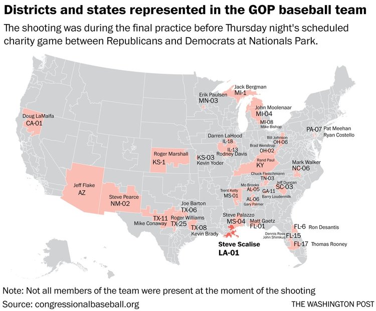 | | What you need to know about the GOP baseball practice shooting |  | | | BY JAMES HOHMANN | | with Breanne Deppisch and Joanie Greve | | | THE BIG IDEA: Democrats won the annual Congressional Baseball Game for seven straight years, but they lost last year because their players were tired. They were tired because they pulled an all-nighter on the eve of the game to occupy the House floor. After an Afghan American, influenced by ISIS propaganda, killed 49 people and injured 58 others at an Orlando nightclub, they were demanding an up-or-down vote on a bill to block people who are on the federal terrorism watch list from being able to buy guns. Their protest failed. Nothing changed. One year later, another horrifying tragedy has hit much closer to home. In an act of domestic terrorism, a gunman shot a Republican congressman, an aide, a lobbyist and two police officers during batting practice on the eve of the Congressional Baseball Game. House Majority Whip Steve Scalise remains in critical condition this morning after being wounded, but in a resolute show of bipartisan unity, tonight's baseball game at Nationals Park will go on. Everyone who knows the Louisiana lawmaker says that's exactly what he'd want.  | | Who is Rep. Steve Scalise? | -- But the more things change, the more they seem to stay the same. It feels like the period of mourning gets shorter, and the finger pointing comes quicker, after each heinous rampage. Marc Fisher says that the shootings on Simpson Field in Alexandria "tore at the nation's civil soul—and perhaps even opened a pathway toward healing." "It's my breaking point," said Rep. Rodney Davis, an Illinois Republican and the catcher on the team. "The way we talk to each other has to change. The political hate has to end." "But if this was a breaking point, it was, sadly and darkly, one in a very long line," Marc writes. "So many shootings in recent years have also been declared the pivot, the last straw, the one beyond which none could be tolerated. Precious children in Newtown, Conn.; partying young people in Orlando; office workers in San Bernardino, Calif., and at the Washington Navy Yard; churchgoers in Charleston, S.C.; military service members at Fort Hood, Tex.; moviegoers in Aurora, Colo.; college kids at Virginia Tech. … Despite the regularity of the incidents, the shock is new and real every time, because each time it happens, another group of people learns a fresh and frightening vulnerability."  | | House gives first responders standing ovation as Ryan praises Capitol police | -- "We are united in our anguish," Paul Ryan told the House yesterday. "An attack on one of us is an attack on all of us." The Speaker received four standing ovations from Democrats and Republicans alike. Dana Milbank flags that Ryan's words closely echoed those of his predecessor, John Boehner, six years ago when then-Rep. Gabby Giffords (D-Ariz.) was shot in the head: "An attack on one who serves is an attack on all who serve." "Then, members of Congress paid tribute to Giffords for eight hours on the House floor, and both sides pledged to temper their rhetoric as they waited for Giffords to return," Dana recalls. "She never returned to Congress, but the sniping did." -- Giffords wrote an op-ed for The Post that just published: "Congress did nothing when I was shot. Lawmakers need courage now."  | | Rep. Barry Loudermilk recalls baseball practice shooting, second by second | -- But even after the shooting of their close friend, there is no appetite at all in the House Republican Conference for tougher gun laws. In fact, many are citing what happened yesterday as a reason to roll back the restrictions that are currently on the books. Republicans earnestly believe that guns can never be completely kept out of the hands of criminals. They are willing to accept some personal risks to their own safety, of a lunatic getting a firearm, because they genuinely see Second Amendment rights as inviolable. Furthermore, the phrase may be a cliché, but most conservatives sincerely believe that the only way to stop a bad guy with a gun is a good guy with a gun. Rep. Barry Loudermilk (R-Ga.), who was on the scene during yesterday's shooting, said Congress should explore allowing lawmakers to carry weapons to defend themselves. "If this had happened in Georgia, he wouldn't have gotten too far," Loudermilk told Mike DeBonis at the Capitol. "I had a staff member who was in his car maybe 20 yards behind the shooter, who was pinned in his car, who back in Georgia carries a 9-millimeter in his car. … He had a clear shot at him. But we're not allowed to carry any weapons here." Rep. Chris Collins (R-N.Y.) said he's going to begin carrying his pistol when he's out in public. "If you look at the vulnerability, I assure you: I have a carry permit. I will be carrying when I'm out and about," he told the Buffalo ABC affiliate WKBW. "On a rare occasion I'd have my gun in a glove box or something, but it's going to be in my pocket from this day forward." If Scalise skipped the final practice before the game, his security detail would not have been there to fire back at the assailant. Several congressmen may have died. "Had there not been a member of House leadership present, there would have been no police present, and it would have become the largest act of political terrorism in years, if not ever," Rep. Tom Garrett (R-Va.) told the New York Times, pointing to legislation he has introduced to make it easier for people to carry a gun in Washington. His bill "would allow the most law-abiding among us to defend themselves," he said. A House Natural Resources committee hearing, scheduled for 10 a.m. yesterday, was postponed because of the shooting. Members were set to consider a bill that would make it easier for gun owners to obtain silencers. The measure, strongly supported by Donald Trump Jr., amends the National Firearms Act of 1934 to remove any reference to silencers. It has been rolled into a la