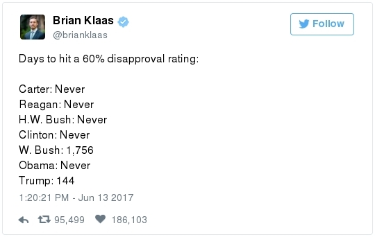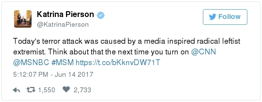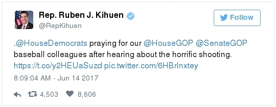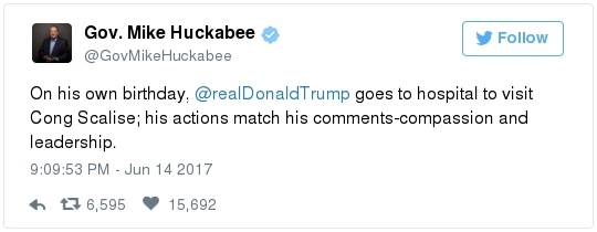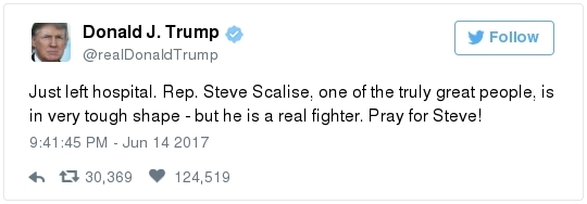 Karen Handel, running for Congress in Georgia's hotly contested special election, is among the GOP figures that Hodgkinson singled out. A post to a Facebook account believed to belong to Hodgkinson called Handel an expletive and said she "wants people to work for slave wages," according to the Atlanta Journal-Constitution. -- An Alexandria lawyer says he repeatedly saw Hodgkinson at the YMCA next to the baseball field: "Stephen Brennwald said he realized after seeing Hodgkinson's photo on the news that he was the same man who had been hanging out for at least the past several weeks in the lobby of a YMCA adjacent to Simpson field. Brennwald said Hodgkinson would regularly show up first thing in the morning — about the same time the shooting took place — and look at his laptop or stare out the window." -- Back in Illinois, local police had gone to Hodgkinson's house in March after he fired 50 rounds "in the pine trees" at the end of his street. He had a valid license for the weapon and stopped shooting at the request of the cops. -- But authorities had charged him with domestic battery and aggravated discharge of a firearm after a 2006 encounter with his daughter. Ann E. Marimow, Patricia Sullivan, Shawn Boburg and Tom Jackman report: "Witnesses said Hodgkinson forced his way into [a neighbor's] home looking for his teenage daughter and grabbed her by the hair when he found her upstairs … His daughter escaped and got into the neighbor's car, but Hodgkinson opened the door of the car, pulled out a pocket knife and cut off the seat belt she was wearing … Hodgkinson punched the neighbor who was in the driver's seat of the car in the face, witnesses told police. Later, Joel Fernandez, the boyfriend of the woman who was punched, went to Hodgkinson's home to confront him. He said Hodgkinson 'walked outside with a shotgun and aimed it at Fernandez face,' a complaint states. Hodgkinson struck Fernandez on the side of his face with the wooden stock of the shotgun and fired off one round as Fernandez ran away." It's not clear why, but the charges were later dismissed.  | | President Trump's full statement on the June 14 congressional baseball practice shooting | TRUMP'S RESPONSE: -- The president went to see Scalise and the other victims at the hospital last night. Abby Phillip reports: "The unannounced visit to MedStar Washington Hospital Center came hours after Scalise emerged from surgery after he was injured during a shooting at a Congressional Baseball Game practice in Alexandria, Va. … Trump and First Lady Melania Trump arrived at the hospital at around 8:40 p.m. on Wednesday night, bringing with them bouquets of flowers for the shooting victims … The first couple spent less than a half hour at the hospital meeting with Scalise's wife and the medical team treating him before returning to the White House." Trump tweeted this after his visit: A SCARY MOMENT: -- Violence against politicians is blessedly rare in this country, but it's not unheard of. At least fourteen sitting members of Congress have been killed in U.S. history. Michael S. Rosenwald and Ian Shapira recall a few of the highest profile incidents: "In 1859, California Sen. David Broderick was called a 'miserable wretch' – and then shot to death – by the state's attorney general during an argument about slavery. Years later, the attorney general was also shot to death. … In 1868, Arkansas Rep. James Hinds was traveling by horse to a speech supporting Ulysses S. Grant when he was assassinated by a Ku Klux Klan member. His killer vanished and was never seen again." -- Lawmakers on both sides have been reporting a major uptick in threats recently. From Buzzfeed: "Multiple Democratic representatives said during a members-only security briefing that they had received calls after the shooting saying, 'You guys are next,' said California Rep. Nanette Diaz Barragàn … Arizona Rep. David Schweikert, a Republican who is not on the baseball team, told reporters that his office had filed four threat assessments on Tuesday, the day before the shooting, based on people emailing and calling his office. He said one of those threats was 'wishing my little girl is dead.'"  Newt Gingrich participates in "The Daily 202 Live" in December. (April Greer For The Washington Post) THE POLITICAL CULTURE: -- Everyone agrees that the political culture has coarsened, and that there is less civility than there used to be. But the discussion quickly deteriorates when people on both sides blame the other. Rep. Steve King (R-Iowa) drove from the Capitol to Alexandria after the shooting to pray. He told reporters that it was impossible to separate the hyperpartisan climate in Washington — especially people protesting Trump — with Republican members of Congress being fired upon at a baseball practice. "The divisions within the country, people that can't accept the results of the election that are determined to try to take this country down, take this organization down," he said, per Amber. "This city was filled up with demonstrations the day after the inauguration, where you couldn't drive down the streets. And we've had demonstrations every week since then, sometimes different topics." King added: "We do need to focus on what's happening to the culture in this country." -- "Some in conservative media gilded the lily," David Weigel reports: "A headline at the Drudge Report read 'Gunman: "Kill as many Republicans as possible." That was a quote from Rep. Mark Walker (R-N.C.) describing what he thought the gunman's motivation had been, not a quote from the gunman. The editor of the conservative Vessel News shared a video by former attorney general Loretta E. Lynch and asked whether the shooter had heeded her 'call' for 'blood on the streets.' In reality, Lynch was referring to civil rights protesters who 'bled' and 'died.'" -- Speaking on Fox News Wednesday afternoon, Newt Gingrich decried what he called "an increasing hostility on the left." "You'