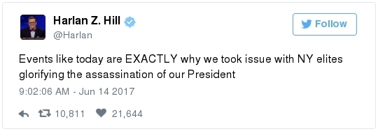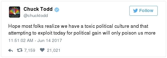 -- Hodgkinson's social media included visceral anti-Trump and anti-Republican rhetoric. Ann E. Marimow, Patricia Sullivan, Shawn Boburg and Tom Jackman mine his posts: "Hodgkinson left a trail of political rants against Republicans and the 'super rich,' and he had adopted a photo of Sanders as his Facebook cover image … Hodgkinson was quick to share his political views online and in letters to his local newspaper. A Facebook page believed to be his features pictures of Sanders and ... a recent post that reads: 'Trump is a Traitor. Trump Has Destroyed Our Democracy. It's Time to Destroy Trump & Co.'" - He made repeated, angry calls to the office of his Illinois representative, Mike Bost (R), but never issued any threats.