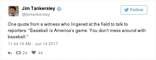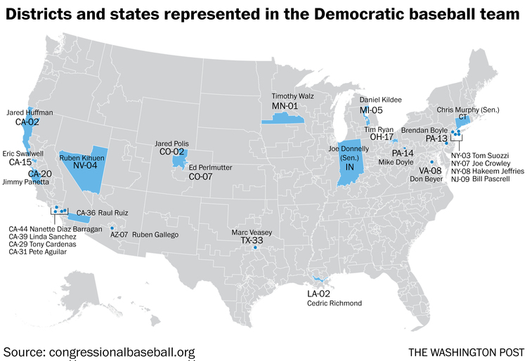 THE STATUS OF THE VICTIMS: Five people, including the gunman, were shot during the attack, and two others were injured. -- Scalise, 51, is the third-ranking Republican in House leadership. His office initially said he was "in good spirits" and had spoken to his wife, Jennifer, by phone before he went in for surgery. Later, MedStar Washington Hospital said in a statement sent at 9:15 p.m. last night that Scalise was shot once in the left hip and that the bullet fractured bones and struck internal organs: "He has received multiple units of blood transfusion. His condition is critical, and he will require additional operations." -- Legislative aide Zack Barth was shot in the leg. The Houston native is a staffer in the office of Rep. Roger Williams and formerly worked on the presidential campaign of Jeb Bush. "I got shot this morning at the baseball fields but I am in the hospital and okay," he wrote in a Facebook status update. "Thank you for the thoughts and prayers." Later in the day, family members said he was released from the hospital and expected to make a full recovery. "[T]hank goodness for the Police who were at the scene," said his father, Tim Barth, who immediately flew to D.C. to be with his son. "It could have been so much worse." -- Matt Mika, a Tysons Food lobbyist and former congressional staffer, remains in critical condition after undergoing surgery at George Washington University Hospital for multiple gunshot wounds, his family said. -- Crystal Griner, a Capitol Police special agent on Scalise's detail, was shot in the ankle and is "in good condition." -- Also injured in the attack were 32-year-old Capitol Police Special Agent David Bailey, who has worked for the department for nearly a decade, and Rep. Williams, who twisted his ankle while scrambling to the dugout after the gunfire broke out. Neither were shot, and each is expected to make a complete recovery. -- Theresa Vargas has some good history on the Capitol Police: "When Congress moved from Philadelphia to Washington in 1800, a single watchman named John Golding was tasked with protecting the Capitol Building … Then in 1827, President John Quincy Adam requested that a Capitol Police force be created … The result was a four-member police force consisting of a captain and three men whose jurisdiction did not extend beyond the streets bordering the Capitol Building. They worked 15-hour shifts when Congress was in session and 10-hour shifts when it wasn't … The force currently employs than 2,100 officers and civilians and has an annual budget of about $375 million … It has lost four members in the line of duty."  | | What we know about the congressional baseball shooter | WHO WAS THE SHOOTER? -- Law enforcement identified the gunman as 66-year-old James T. Hodgkinson, an unemployed home inspector from an Illinois suburb of St. Louis who had been living in his van in Alexandria for the past few months. (Peter Hermann, Amber Phillips, Paul Kane and Rachel Weiner have more.) -- Bernie Sanders said he was "sickened" to learn that Hodgkinson had volunteered on his 2016 presidential campaign, although an aide said that he had no formal role and that no one could remember him. - The shooter's affinity for Sanders could raise uncomfortable questions for his supporters. The New York Times' Yamiche Alcindor reports: "[The shooting] may prove to be an unexpected test for a movement born out of Mr. Sanders's left-wing, populist politics and a moment for liberals to figure out how to balance anger at Mr. Trump with inciting violence. 'Both sides need to look in the mirror,' said Nina Turner, a former Ohio state senator who campaigned for Mr. Sanders and is working on a new think tank started by the senator's wife. 'We have to decide what kind of language we are going to use in our political discourse.'"