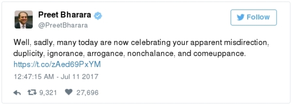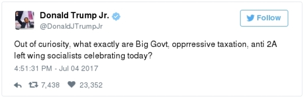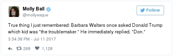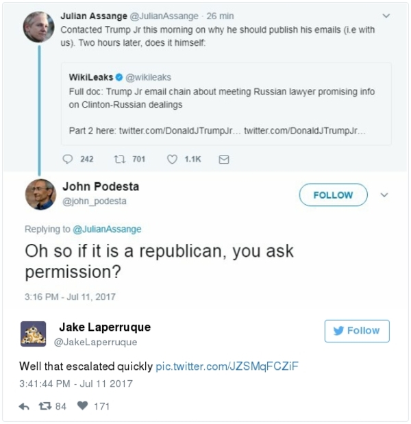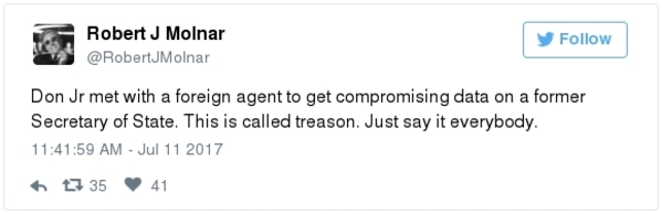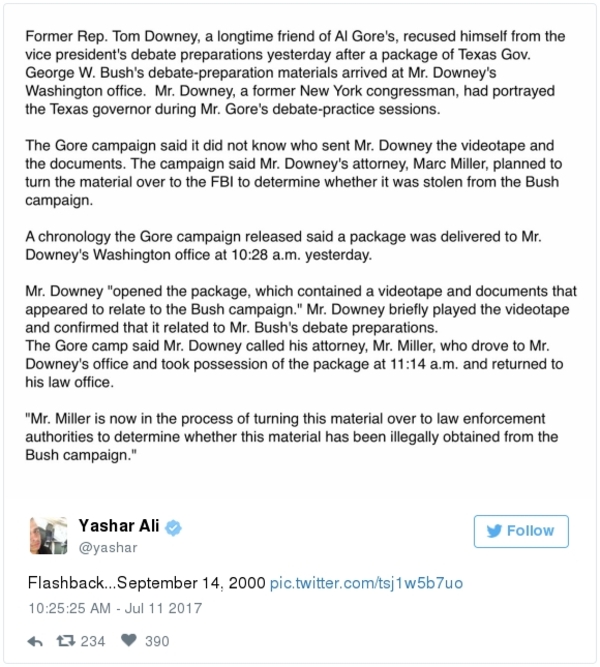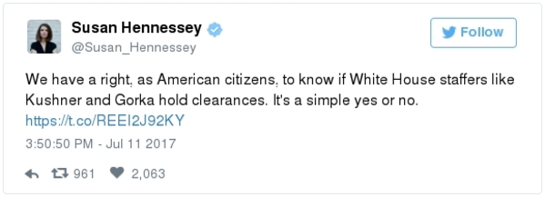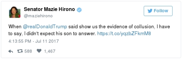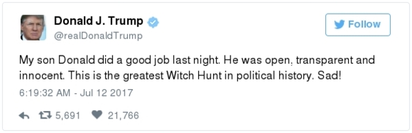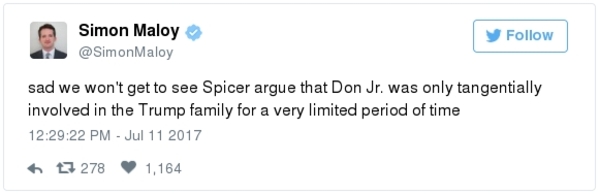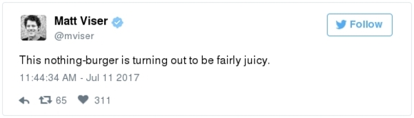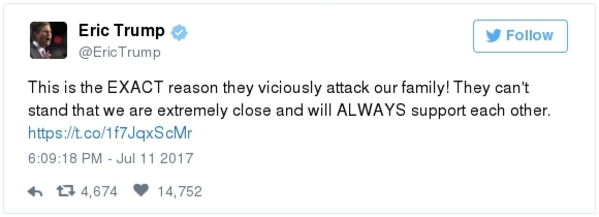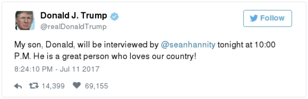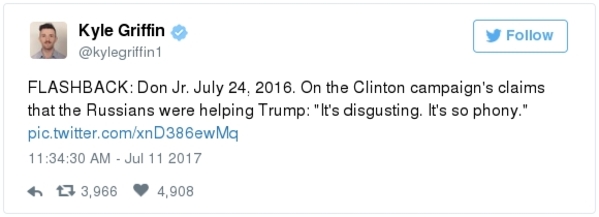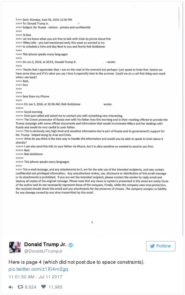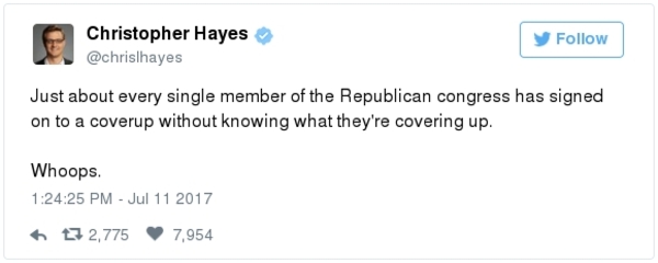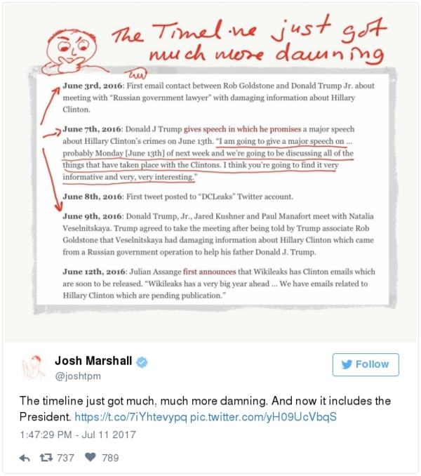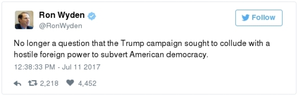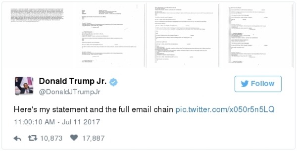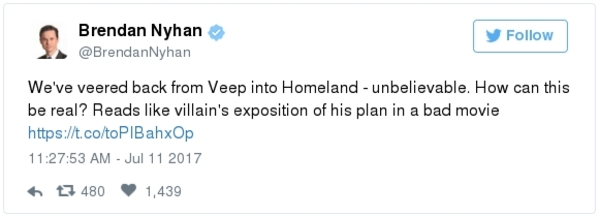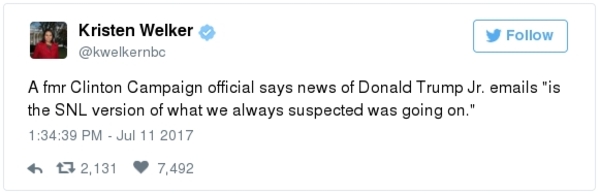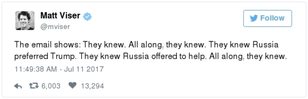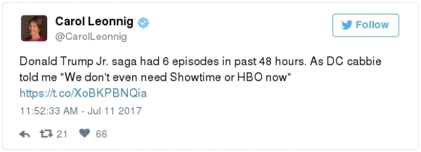 -- Meanwhile, Vice President Pence – who in the past has vigorously defended Trump when asked about the Russia scandals – tried to distance himself: "He was not aware of the meeting," Pence press secretary Marc Lotter said in a statement. "He is also not focused on stories about the campaign -- especially those pertaining to the time before he joined the campaign." -- There were distinct camps on the Hill, Monica Hesse and Ben Terris write in a colorful piece for Style: "Democrats, who had oodles of time to talk about the tweets in question, and GOP lawmakers, who had not even heard of the tweets in question, and who is Donald Trump Jr., and what is a Twitter anyway? … Sen. Dianne Feinstein gravely told reporters that the context of the meeting was 'pretty clear,' while behind her, Sen. Ted Cruz was shuffling past with his hands clamped on the shoulders of two small children walking in front of him. 'I'm just trying to have lunch with my daughters,' he explained. Elsewhere, Sen. Rand Paul had no daughters to lunch with, and so he kept his hand clamped firmly to his cellphone as he strode past … (We are working on the assumption there was a person on the other end of the line.) We are reminded of Winston Churchill: This is not the end. This is not even the beginning of the end. But it is, perhaps, a sign that reality has become untethered from itself and we have fallen into a parallel dimension where there is no beginning or end." -- Some elected Republicans did speak out: Sen. Lindsey Graham (R-S.C.) called Don Jr's email chain setting up the meeting "disturbing." "On its face, this is very problematic," he said. "Anytime you're in a campaign and you get an offer from a foreign government to help your campaign, the answer is 'no.'" Rep. Lee Zeldin (R-N.Y.), who on Monday dismissed Trump Jr.'s meeting as a "big nothing burger," appeared to retreat on that claim. "I voted for @POTUS last Nov. & want him & USA to succeed," he wrote on Twitter, "but that meeting, given that email chain just released, is a big no-no." -- "In conservative media, a very different and parallel conversation unfolded: about the 'Destroy-Trump Media' and its Wile E. Coyote-like attempts to bring down a president," Weigel reports. "On his radio show, Rush Limbaugh told listeners that he was 'watching people lose their minds' because 'they've got nothing.' On 'Fox and Friends' … co-host Brian Kilmeade asked Trump attorney Jay Sekulow if 2016 campaign veterans could vet themselves and release any more information about meetings with Russians, 'so this drip-drip-drip doesn't fuel other haters.' 'The Destroy-Trump-Media's Russia psychosis is now back, and it's worse than ever,' Sean Hannity [said Monday]. On conservative media, from Reddit to Fox News, the story has largely been covered as a conspiracy theory … In pro-Trump coverage of the story, any theory has been plausible — so long as it absolved the president. [One theory] advanced by Sekulow and by Hannity, was that Clinton's team was obscuring its own 'collusion' — meetings between campaign staff and representatives of Ukraine and China." Conspiracy theorist Alex Jones had the most creative explanation for why Jr. took the meeting with the Russian lawyer: he was trying to suss out whether she was a Kremlin spy. From Media Matters: "That's Donald Jr. doing his job. So that he's trying to find Russian spies, he is now a Russian spy," Jones said yesterday on his radio show. | | Donald Trump Jr.'s emails aren't a smoking gun. They're a blazing gun. Here's why. | HOW IT'S PLAYING: -- The Post's Editorial Board says the Russia meddling story is "no longer just smoke — it's fire." -- "The future of the Trump presidency is in the hands of — wait, who is this guy?" by Kathleen Parker: "So, apparently, the future of the Trump presidency is in the hands of [Rob] Goldstone. He set up the meeting; he brought Trump Jr. into a damning email exchange; he promised dirt. Wait, who is this guy again? Well, that's a very good question. He's an intermediary for Veselnitskaya, who either (a) works for the Kremlin and possibly even Vladimir Putin; or (b) is just a lawyer/lobbyist interested in U.S. policy. Wouldn't we like to know?" -- "This is no 'rookie mistake.' The Trump team shouldn't even be on the field," by Dana Milbank: "There have been enough rookie errors to send this whole team back to Double-A ball. The longer this goes on — we're now six months into Trump's term — the less it looks like growing pains than incompetence and mismanagement aggravated by nepotism and dishonesty." -- "The Donald Trump Jr. emails could hardly be more incriminating," by Ruth Marcus: "By explicitly linking the source of the information to the Russian government and by describing it as 'part of Russia and its government's support for Mr. Trump,' Goldstone made crystal clear that he was offering the campaign a chance to collude — yes, that word is appropriate here — with a foreign government to 'incriminate Hillary' Clinton and help win the presidency. By reacting as he did, eagerly accepting the offer of this foreign aid, Trump Jr. made clear that he was a willing part of this incipient conspiracy — and yes, that word is appropriate here, too." -- "Trump Jr probably believes his own talking points, a trait that he has inherited from his father. … The leaders of the Republican Party, however, cannot claim similar ignorance," Walter Shapiro writes for The Guardian. "Enough with the furrowed brows and expressions of 'deep concern.' A single prominent Republican in Congress saying flatly, 'This is unconscionable and forever unsupportable,' is more important than 873 liberal law professors chattering about 'a textbook case of collusion' and 'obstruction of justice.' In a sense, the Republicans fit Colin Powell's Pottery Barn rule about Iraq: 'You break it, you own it.' Republican leaders, from Paul Ryan to Reince Priebus, allowed Trump to break the Republican Party and no