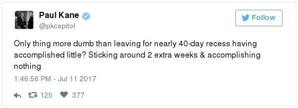 Christopher Wray sits down with Chuck Grassley last month. (Andrew Harrer/Bloomberg) DRIVING THE DAY: -- The confirmation hearing for Trump's pick to lead the FBI starts later this morning. Devlin Barrett and Ellen Nakashima have a new profile of Christopher Wray: "[In 2003,] Wray, then the head of the Justice Department's criminal division, heard that the higher-ups at the department — including then-Deputy Attorney General James B. Comey and then-FBI Director Robert S. Mueller III — were preparing to resign in a dispute with the Bush administration. Wray pulled Comey aside to tell him he would follow his lead. If Comey resigned, he would, too … Questions about Wray's ability to be an independent leader, resistant to political pressures, are expected to dominate his hearing. … Friends of Wray's say his career has prepared him to manage White House expectations while preserving the traditional independent operations of federal law enforcement." | | McConnell to unveil revised health-care plan | CRUNCH TIME ON HEALTH CARE: --Senate Republicans plan to introduce a revised version of their health-care bill on Thursday, despite the fact that the debate's outlines seem pretty firmly drawn in the sand, NYT's Thomas Kaplan and Robert Pear report, adding that pessimism "pervaded" the Capitol: "Senator Charles E. Grassley, Republican of Iowa, said Tuesday that he was 'very pessimistic' about passing a bill, while Senator John McCain, Republican of Arizona, said it was 'very possible, very probable' that the Senate bill was dead ... The revised bill is expected to include a $45 billion fund to help combat the opioid epidemic, as well as a provision allowing consumers to use health savings accounts to pay for premiums ... Senate Republicans are also likely to keep a pair of taxes imposed by the Affordable Care Act on people with high incomes ... But the largest changes to the health care system are likely to remain in the bill." -- Mitch McConnell announced that the Senate would remain in session to deal with health care, and other things, for the first two weeks of August. Kelsey Snell, Sean Sullivan and Juliet Eilperin report: "McConnell's announcement appeared designed to give Republicans time to move to other matters, such as raising the federal debt ceiling, after dispatching with a health-care vote … But the ideological disagreement over how to revise the ACA continued among Republicans … Senate GOP leaders are trying to convey to members that they face a 'binary choice' … between getting a deal done among themselves or having to work with Democrats." -- McConnell's decision to draft the health-care bill outside of the normal order of committee hearings has left the legislation "orphaned" without any real defenders. Paul Kane writes: "For less than 25 seconds [Tuesday], McConnell gave a basic update on the timing of the legislation, never made the case for why Republicans should support it and then moved on for another minute to attack Democrats on unrelated issues. That's the way it has gone for the Better Care Reconciliation Act ever since it was unveiled nearly three weeks ago. In public appearances, and often in private GOP meetings, Republican after Republican outlines the reasons that they stand opposed to the legislation, as written, with almost no one taking up the mantle of defending a proposal that was unpopular from Day One … As a result, it has no real parent figure, no one invested in its success, no one primarily responsible for promoting it to other colleagues and the media." --The Times's Carl Hulse says "Republicans are failing at governance and they know it:" "In deciding to forgo at least the first two weeks of their regular summer getaway, [McConnell] and his colleagues essentially admitted that they could not afford to go home to face constituents without making a concerted effort to pass contentious health care legislation and put some other points on the board." -- Several major questions have yet to be answered about what will actually be in the Senate bill. Axios's Caitlin Owens reports: "The Medicaid portions of the revised bill likely will stay largely the same as the first version — including the growth rate for new per-person funding caps and the process for phasing out the Affordable Care Act's Medicaid expansion. This is a loss for several moderates … A small tweak is likely to be added that would benefit Louisiana … This would help with Sen. Bill Cassidy's concerns … The jury's still out on whether to include Sens. Ted Cruz and Mike Lee's Consumer Freedom Option in the bill, but there's a strong chance it doesn't meet Senate budget rules anyways." -- A little-noticed provision in the Senate bill could allow those with preexisting conditions to be charged more than healthy Americans. Vox's Sarah Kliff reports: "[The provision] lets self-employed Americans opt out of the individual market and buy into the health plans that large employers provide, which have more lax regulatory standards. Health policy experts at the Kaiser Family Foundation and Georgetown University have recently analyzed this provision, and concluded that these 'small-business health plans' could siphon off healthy consumers." -- The uncertainty has Lindsey Graham to consider devising an alternative plan that could garner enough Democratic votes to pass the Senate. Politico's Austin Wright reports: "'I'm working with some senators to come up with a new approach to deal with how to replace Obamacare,' Graham told reporters. 'I think it will be fundamentally different. I think it will potentially attract some Democrats' … He said he would begin unveiling details of his plan in '24 to 48 hours.'" Hill scribes responded to news that recess isn't happening until two weeks into August: From a Vox reporter: A youth looks at a new, taller fence being built along U.S.-Mexico border in Ciudad Juarez, Mexico. (Rodrigo Abd/AP) THE TRUMP AGENDA: -- The House Appropriations Committe