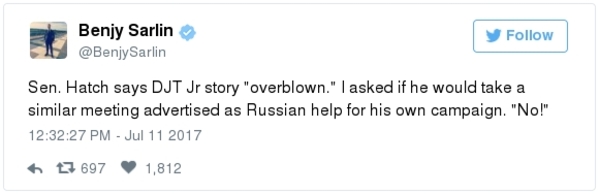-- Former Obama White House Counsel Bob Bauer, a partner at Perkins Coie and professor at New York University, explains why the Trumps' legal troubles could worsen: "This is not an individual venture of Trump Jr.'s that the Trump campaign can somehow disavow," Bob writes for Fortune. "While the individuals in question may not escape liability, the serious issue raised by the meeting exposes the campaign as an organization to criminal legal jeopardy. Under campaign finance regulations, the meeting could without question be considered a solicitation (at least under the facts so far known). The law defines a solicitation to include any request for a contribution or 'anything of value' from a foreign government or entity, even if the request is implicit in the circumstances rather than expressly communicated. The regulations provide specifically that the solicitation 'may be made directly or indirectly,' based on all relevant factors, including the 'conduct of the persons involved in the communication.'" -- Sen. Tim Kaine (D-Va.) even used the "T" word: Hillary Clinton's running mate, who attended Harvard Law School and taught at the University of Richmond School of Law before going into politics, said the investigation has now moved beyond obstruction of justice. "This is moving into perjury, false statements and even potentially treason," he told reporters. -- Special Counsel Robert Mueller's investigators plan to examine the meeting and email exchanges disclosed yesterday as part of the broader Russia investigation, CNN reports: "The details of the interactions between Trump Jr., (Rob) Goldstone and Veselnitskaya weren't fully known to federal investigators until recently, according to three U.S. officials familiar with the probe. The FBI, as part of its counter intelligence probe and the investigation into Russian meddling, has scrutinized some of Donald Trump Jr.'s business dealings and meetings even before the latest meeting was disclosed." -- "No one should presume to draw definitive conclusions from the contents of the emails as to possible jeopardy for Trump Jr.; where the overall investigation, which includes various threads, is heading; or most specifically how it will end," The Post's chief correspondent Dan Balz cautions. "But in terms of public disclosures, what came out Tuesday was [both] breathtaking and surreal … For those who had grown tired of the Russia issue or who believed it was losing potency or who thought the biggest surprises were in the past, Tuesday's revelations provided dramatic proof that the investigation is alive with no end in sight." Rand Paul talks on his cellphone while walking past throngs of reporters on Capitol Hill. (Katherine Frey/The Washington Post) NOT BITING: -- Back on the Capitol Hill, most Republican lawmakers did their best to duck the questions about Don Jr.'s emails from reporters, either avoiding them or issuing vague justifications for Jr.'s behavior, David Weigel reports. Another safe response from Republicans bemoaned how the "endless Russia story" was distracting from the party's agenda: - "He's not given any particular assignment in the administration," Sen. Orrin Hatch (R-Utah) said of Trump Jr., adding: "I think this can be way overblown."