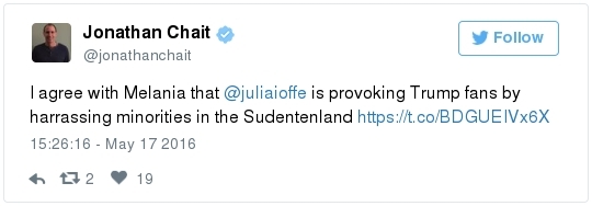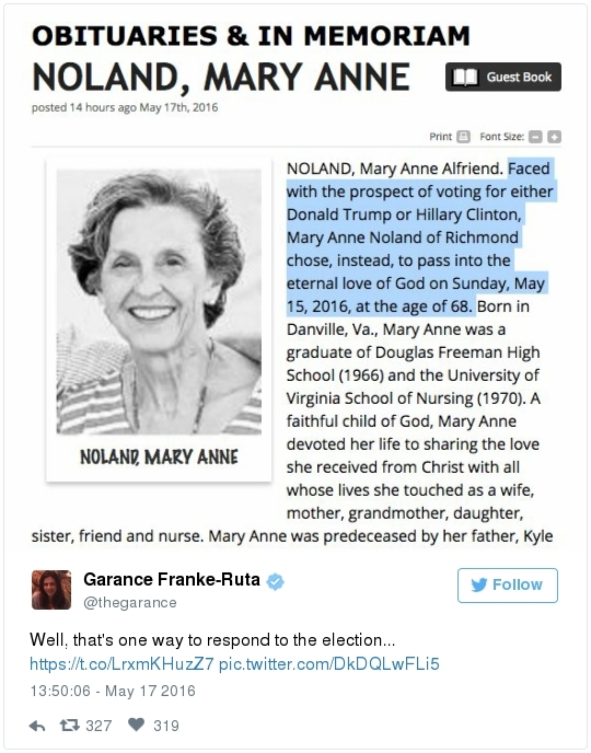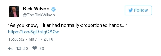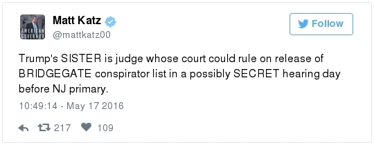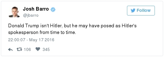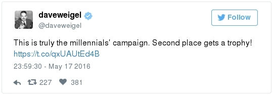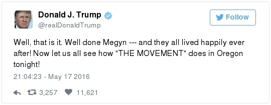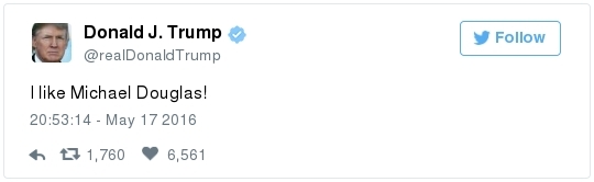 -- Trump's comments come in the face of a withering new Democratic advertising assault. The pro-Clinton super PAC Priorities USA began a major TV ad campaign this week that portrays Trump as dangerous and divisive. The first spot features a showcase of derogatory comments that Trump has made about women:  | | Speak | -- Trump can ask donors to give nearly $500,000 in support of his White House bid and down-ballot Republicans, thanks to a new fundraising agreement with the RNC. From Matea Gold: "The Trump Victory Fund -- a joint committee between the Trump campaign, the RNC and 11 state parties -- will solicit larger checks than have ever been sought by presidential nominees through such ventures, thanks to legal changes made in 2014 that expanded the fundraising abilities of national parties." The joint effort follows a similar fundraising venture set up by Clinton and the DNC last year, allowing donors to give up to $356,100 annually. The presumptive Republican nominee also plans to raise funds through the Trump Make America Great Again Committee, a joint fundraising committee set up just between his campaign and the RNC." -- The Trump campaign has identified roughly 15 states where it plans to install state directors by the end of the month, the AP reports. "They include traditional battlegrounds like Ohio, Florida and Virginia and more challenging terrain such as Minnesota, Michigan, Wisconsin, Pennsylvania and Maine — places Republican have lost for the last six presidential elections or longer. Target states also will likely include Republican-leaning Georgia, where demographic shifts benefit Democrats." -- Trump said he would be "willing to talk" with Kim Jong Un to try to stop North Korea's nuclear program, proposing a major shift in U.S. policy toward the isolated nation. In an interview with Reuters, Trump also called for a renegotiation of the Paris climate accord, said he disapproved of Russian President Vladimir Putin's actions in eastern Ukraine, and said he would seek to dismantle most Dodd-Frank financial regulations. -- A remarkable nugget from a Chris Christie biographer who works for WNYC/NPR: -- Trump said he is sending a videotaped message to be played during a conference of the nation's largest Hispanic evangelical group. But there's no guarantee that the greeting will be aired. Officials say they are reviewing the video and will only share it if the message is conciliatory and respectful to the immigrant community. (Ed O'Keefe) -- Jeb Bush laced into Trump over his taco salad tweet: "First, not all Hispanics are Mexican," he told a Dutch newspaper ahead of a speech in Amsterdam. "Second, not all Hispanics eat tacos. Third, showing your sensitivity by eating an American dish is the most insensitive thing you can do. Fourth, to say this, next to all things he already said, is a further insult. … It's like eating a watermelon and saying, 'I love African-Americans.' … If we lose in November, we Republicans have ourselves to blame."  Ashraf Nubani (Photo by Marvin Joseph/The Washington Post) WAPO HIGHLIGHTS: -- "The blind attorney who drove himself into bankruptcy defending accused terrorists," by Terrence McCoy: "Day and night, the most feared people in America contact Ashraf Nubani. In the past 15 years, Nubani, a Springfield, Va., lawyer, has represented either in the media or legally at least 21 people accused of terrorist ties. He defended Osama bin Laden's son-in-law. He defended a 23-year-old man accused of plotting to assassinate then-President George W. Bush. He defended another man said to be a Hamas operative. One of the unexpected byproducts of the war on terrorism has been the emergence of a small fraternity of lawyers who have a specialty in defending suspected terrorists." Following the Sept. 11, 2001 attacks, investigators turned their attention to [Washington suburbs] … where seven of the 19 al-Qaeda hijackers spent time before the attacks. This has since precipitated more than 500 terrorism-related prosecutions … and a need for lawyers who know how to defend clients embroiled in them. One is Nubani, a controversial lawyer who makes no bones about the fact that he isn't a criminal lawyer by training — a matter some clients now say harmed their cases." SOCIAL MEDIA SPEED READ: — ZIGNAL VISUAL There were more than 600,000 Trump tweets on Tuesday, with mentions peaking at about 8:30 p.m. Eastern. Sure, Trump was on his way to a victory in two primaries, but...The top Trump-related tweet was about Michael Douglas, who appeared on the Megyn Kelly special after him (Trump live-tweeted the show): -- Correction: Yesterday's Zignal section misidentified Azealia Banks. She is a rapper from New York and not engaged. Best slogan parody so far? Greg Abbott, governor of Texas, has this to say to Obama: Lt. Gov. Dan Patrick tweeted this: Marco Rubio continues his return to Twitter. After Chris Cillizza posted a follow-up after the senator's late-night tweet stream, Rubio responded: The leader of the Republican Resistance to Trump is still having fun with the "Jewish renegade" label bestowed upon him by Breitbart: Melania Trump said writer Julia Ioffe "provoked" anti-Semitic trolls with the profile she wrote about her: Jokes ensued: She also said her husband "isn't Hitler." Here's how Twitter responded: This obituary went viral: Have you seen Republican operative Michael Steel's puppy? It was primary day in Kentucky. Remember Alison Lundergan Grimes? Bill Clinton campaigned in Puerto Rico: Debbie Wasserman Schultz sprained her ankle during softball practice: John and Cindy McCain traded anniversary posts: Sean Duffy thanked the Capitol Police for National Police Week: Derek Kilmer celebrated Norwegian Independence Day. Click for the caption, which parodied Trump:  Kirsten Gillibrand celebrated her son's birthday: Meet Steve Daines's dogs: Should Jason Chaffetz eat this popcorn? He asked his Instagram followers:  | | HOT ON THE LEFT: "The Wire Actor Wendell