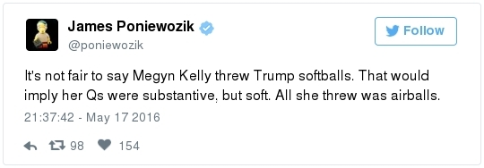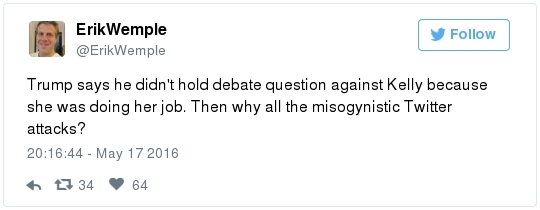 - He also gave an unprompted, lengthy defense of his statement that Fox's Kelly had "blood coming out of her wherever": "When that narrative started, I said, 'You've got to be kidding. Who would even think of that? … I said 'wherever' – ears, nose. I wasn't even thinking about the other."