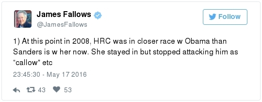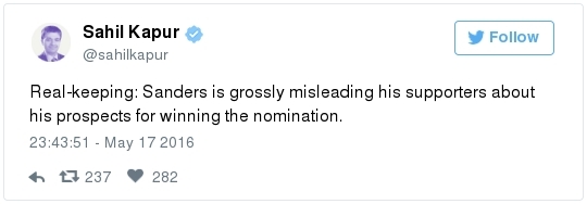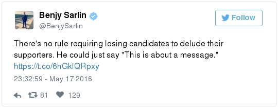 Bernie Sanders at a rally in Carson, California, last night. (Reuters/Lucy Nicholson) THE BIG IDEA: -- Bernie Sanders won yesterday's Democratic primary in Oregon by 8 points, and Hillary Clinton has declared victory in Kentucky. The AP says the Bluegrass State remains too close to call. The front-runner leads by about 2,000 votes out of half a million cast, less than one half of one percent. Asked whether Sanders would consider seeking a recount, spokesman Michael Briggs emails that they'll "take a closer look at the numbers … and make a decision" later today. A Clinton victory would end Sanders's mini-winning streak. -- Sanders pulled no punches as he celebrated the returns in California last night. He blamed his losses on closed primaries and called on the Democratic Party to "open the doors" and "let the people in."  Sanders supporters at the Nevada State Democratic Party convention in Las Vegas on Saturday. (Chase Stevens/AP) -- The comments came at the end of a long day, during which Nevada's Democratic Party filed a formal complaint accusing Sanders of inciting "actual violence" among his supporters at last weekend's state convention. Senate Minority Leader Harry Reid called the convention fracas a "test of leadership." Democratic National Committee chair Debbie Wasserman Schultz told CNN that Sanders's response to the chaos has been "anything but acceptable." The Vermonter dismissed the claims as "nonsense," detailing grievances about how Nevada and other states have handled their delegate selection processes. "At that convention, the Democratic leadership used its power to prevent a fair and transparent process from taking place," Sanders said, casting the episode as just the latest episode of the national party trying to silence the grassroots. -- There are growing fears that the July convention in Philadelphia could be chaotic, perhaps even violent. -- Sanders is quickly becoming a figure every bit as divisive and polarizing among Senate Democrats as Ted Cruz is in the eyes of his Republican colleagues. He may not have forced a government shutdown, but his obstinacy may yet imperil HRC. His defiance is burning bridges, which will make it harder for him to be an effective member of the Senate going forward. -- We've reached another pivot point in the race. The donnybrook at the convention has been a wake-up call for many liberal commentators, who have viewed Bernie positively because of his success at pulling Hillary to the left. But a new mindset has begun to take hold: If Trump becomes president, Sanders will deserve a big share of the blame. Take this sampling of commentary that posted overnight: The New Republic's Dana Houle: "It is Sanders's prerogative to remain in the race. But exercising that prerogative makes it easier for mega-wealthy conservatives to spend hundreds of millions of dollars to lethally bludgeon both Clinton's candidacy and the progressive agenda to which Sanders has devoted his career. This is not solely about combating the grave threat of a Trump presidency. It is also about the potential of a Democratic landslide and the progressive achievements that could follow, which is an opportunity too rare and precious to squander … The best way for Sanders to advance the progressive cause is to end his campaign and unabashedly ask his supporters to join him in helping to elect Clinton." Talking Points Memo's Josh Marshall: "Sanders is telling his supporters that he can still win, which he can't. He's suggesting that the win is being stolen by a corrupt establishment, an impression which will be validated when his phony prediction turns out not to be true. Lying like this sets you up for stuff like happened over the weekend in Nevada." Mother Jones' Kevin Drum: "Before this campaign, [Sanders] was a gadfly, he was a critic of the system, and he was a man of strong principles. He still is, but he's also obviously very, very bitter … By all objective measures he did way better than anyone expected and had far more influence than anyone thought he would, and he should feel good about that. Instead, he seems more angry and resentful with every passing day." The Atlantic's Clare Foran: "As the Sanders campaign presses forward, it must carefully consider whether the senator's ambition for a political revolution is a goal best achieved by actively stoking the anger of his supporters—and, in a sense, encouraging them to tear it all down." Vox's Jeff Stein: "Sanders needed to win Kentucky to maintain an increasingly far-fetched path to the Democratic nomination. The fact that he lost — albeit by what appears to have been a very small margin — will only dramatically increase the calls for him to exit the race." -- A number of top Sanders staffers have left the campaign in recent days, including his director of technology and three out of four members of his original California leadership team, Politico reports. The new departures come just a few weeks after Sanders let hundreds of field staffers go in an effort to slash costs. -- A Sanders superdelegate flipped his allegiance to Clinton, per Bloomberg. Emmett Hansen II, Democratic National Committeeman for the U.S. Virgin Islands, shifted his support. "There are no more windmills to joust against and no more mountains to climb," he said. -- The mainstream coverage is overwhelmingly negative. "He lost," writes Jon Ralston, the dean of the Nevada press corps. "And the reaction to the vanquishing was akin to the petulant mewling of a baby who had been pampered until the moment he first was told no, wailing with no purpose other than to be loud. And just like an infant, the Sanders folks wanted it to be all about them … I seriously doubt he can put out the fire he has set." "Sanders doesn't seem very interested just now in preserving goodwill he's built up within Democratic Party after losing nomination," writes The New York Times's John Harwood. "Clinton is now 96 percent of the way to reaching the 2,383 deleg