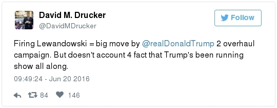 - Trump fired Lewandowski at a meeting Monday morning that was attended by the candidate's adult children.