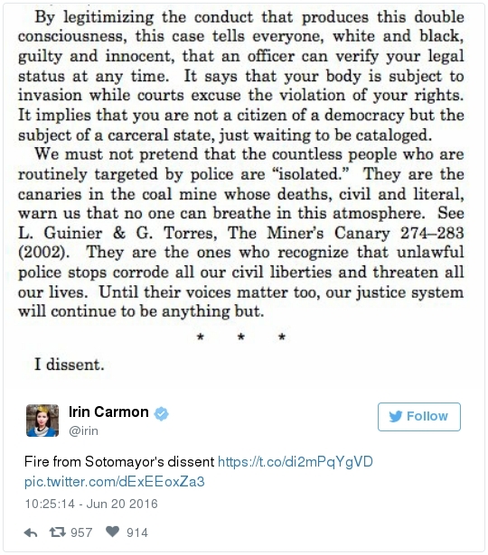 - The Supreme Court gave police more power to stop and question people on the streets, relaxing a so-called exclusionary rule that bans the admission of unlawfully-seized evidence. Justice Sonia Sotomayor issued a blistering 12-page dissent, saying it would exacerbate illegal stops of minorities. (Robert Barnes)