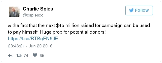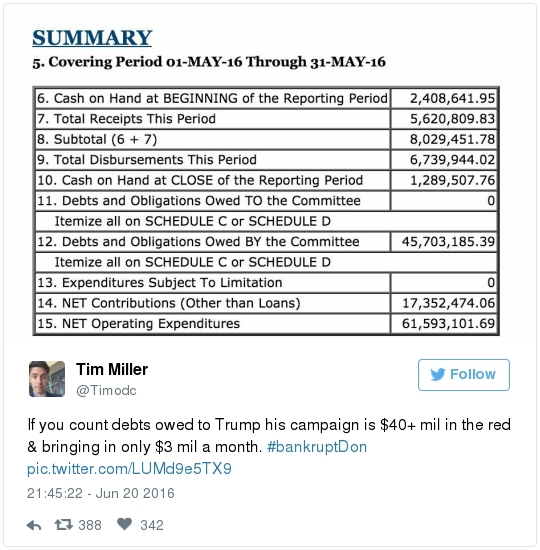 Donald Trump campaigns in Phoenix on Saturday. (Photo by Ralph Freso/Getty Images) THE BIG IDEA: Salman Rushdie floated last fall that Donald Trump is a Democratic plant whose ultimate goal is to get Hillary Clinton elected president. To many conservatives, this feels less and less facetious. The presumptive GOP nominee has spent the past few weeks doing almost everything you would do if you were trying to throw an election, from attacking a federal judge over his Mexican heritage to not building a serious ground game or actively raising the money necessary to wage a credible campaign for the presidency. At the end of a day that started with Trump firing his campaign manager (much more on that below), he filed an embarrassing May fundraising report late last night with the FEC. Despite raising $3.1 million and loaning himself another $2 million, Trump began this month with less than $1.3 million cash on hand. Clinton, by comparison, raised $28 million and started off June with $42 million in cash. Bernie Sanders, with his campaign winding down, still brought in $15.6 million last month and had $9.2 million cash on hand. "If fundraising is, at its root, a test of whether you can get people to vote for you with their checkbooks, Trump failed in May," Chris Cillizza assesses. "And he failed with every possible advantage working for him: Momentum, decent-to-good polling and, at least for part of the month, a Republican Party that seemed willing to unify behind him." -- To be sure, Trump is not running anything close to a conventional campaign. And we might be making a mistake judging him by those standards. A big part of his appeal is that he is unorthodox. He beat better-funded Republicans in the primary, and he can afford to raise less than Clinton because of the free media attention he commands and the sheer force of his personality. But being outraised so dramatically (nine-to-one!) undeniably puts him at a palpable disadvantage in the nuts-and-bolts side of 2016. And a general election is a far different beast than a Republican nominating contest. -- Trump spent $6.7 million in May. That's down from $9.4 million in April, but it's actually a pretty stunning amount when you consider that he's not advertising or building a serious field operation. So where did all the money go? Matea Gold and Anu Narayanswamy report that the campaign paid out more than $1 million to Trump-owned companies and to reimburse his own family for travel expenses. Here are some of the campaign's biggest expenditures: - Campaign swag and printing - $958,836: Hats, pens, T-shirts, mugs and stickers