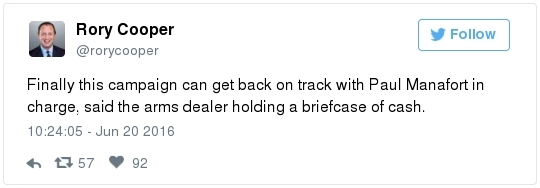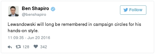 -- Michael Caputo, a communications and political adviser to Trump, resigned yesterday afternoon after sending the above tweet celebrating Lewandowski's departure. He wrote in a resignation letter that the post "was too exuberant a reaction to this personnel move." How it's playing – -- "In some ways, Lewandowski's story is the story of the Trump campaign," Politico's Kenneth Vogel and Ben Schreckinger argue: "The scrappy 42-year-old from the hardscrabble mill town of Lowell, Massachusetts, didn't have any presidential campaign experience when he was plucked from relative obscurity to run Trump's presidential campaign prior to its June 2015 launch. … Lewandowski quickly built a strong rapport with Trump by treating him with absolute reverence, unfailingly referring to him as 'Mr. Trump' or 'Sir' — even when Trump wasn't around — and encouraging him to act on his bombastic instincts. But he'd grown increasingly reckless in his power struggles … And he'd already told associates more than once in the past few months that he was on the verge of quitting. So when he was informed he was being relieved of his once-dream job, Lewandowski didn't argue. 'The gloves had come off a while ago, and Corey spent a lot of energy fighting, which took away from the campaign,' said one Lewandowski associate. He 'was surrounded by enemies,' the source added." -- Trump is getting defined in June, and it will be impossible for him to change perceptions of himself once they've gelled, Maggie Haberman says in The New York Times. -- "Simply replacing Lewandowski won't do anything to help the Trump campaign stop the slide if Trump does not have some kind of epiphany and come to realize that he is the root of his problems," writes Republican fixer Ed Rogers, on the PostPartisan blog. "So far, there is still no sign that Trump sees himself, what he thinks and how he expresses himself as the real problem." -- Lewandowski himself, however, painted a rosy portrait of the campaign during several surreal TV interviews after he was escorted out of Trump Tower, denying the campaign was beset by internal skirmishes and refusing to criticize Trump. -- The Stop Trump movement now counts 400 delegates as allies, quickly transforming what began as an idea tossed around on social media into a force that could derail a national campaign," Ed O'Keefe reports. "While organizers concede their plan could worsen internal party strife, they believe they are responding to deep-rooted concerns among conservatives about Trump. … 'Short-term, yes, there's going to be chaos,' said Kendal Unruh, co-founder of the Free the Delegates movement. 'Long-term this saves the party and we win the election. Everything has to go through birthing pains to birth something great.' Unruh said her cause is winning support from 'the non-rabble rousers. The rule-following, churchgoing grandmas who aren't out protesting in the streets. This is the way they push back.'" -- "A delegate revolt has become Republicans' only option," conservative columnist Michael Gerson argues in his column today. MORE ON THE DONALD: -- Trump will meet with nearly a thousand social conservative leaders this morning in New York City. Time Magazine's Elizabeth Dias previews: "What started as a closed-door gathering of 400 social conservative leaders to test Trump's values has grown to a daylong conference of 1,000, involving nearly all the traditional political influencers of the religious right. For some, it is an effort to get Trump to better understand their policy positions. For others, it is a late-breaking effort to try to get the GOP's most reliable voter base on board with its most polarizing candidate in decades." Former Arkansas Gov. Mike Huckabee will moderate a Q&A session between leaders and Trump, and Jerry Falwell Jr. is expected to introduce Trump and give a series of remarks.Trump will also roll out an "Evangelical Executive Advisory Board," to include televangelist Paula White, James Dobson and Tony Suarez, per Bloomberg. -- Trump walked back his suggestion that armed club-goers could have prevented the Orlando massacre, following heavy criticism from gun safety advocates and even the NRA: "When I said that if, within the Orlando club, you had some people with guns, I was obviously talking about additional guards or employees," he tried to clarify Monday in a tweet. (Jose A. DelReal) -- Joe Biden said Trump is "making religion the enemy" with his anti-Muslim rhetoric: "If we denigrate them, if we talk about them not being particularly useful and competent …. There's 1.5 billion Muslims in the world," he told CBS's Charlie Rose. "If we make the religion the enemy, where the hell do you think we're going to get the cooperation?" -- A man arrested at Trump's Las Vegas rally for trying to grab an officer's gun told authorities he had been trying to assassinate the candidate. The 19-year-old, Michael Sandford, told officers he had been planning for "about a year" and was convinced he would die in the attempt, the AP reports. He said he also reserved a ticket for a Trump rally in Phoenix, scheduled for later in the day, as a backup. He told authorities that he went to the Battlefield Vegas shooting range the day before the rally and fired 20 rounds from a 9mm Glock pistol to learn how to use it. Employees at the range confirmed that.  | | British man at Las Vegas rally tried to steal officer's gun to kill Trump |  Clinton poses with a fan -- donned in photos of her face -- after an Ohio campaign event. (AP /Andrew Harnik) MORE ON THE DEMOCRATIC RACE: -- Clinton will give a series of talks on the economy this week, delivering a one-two punch. Today she will paint Trump as "reckless and misguided" in his business practices. Tomorrow she will unveil her own proposals for the country. The speech will mirror the point-by-point attack she delivered on Trump's foreign policy earlier this month, Anne Gearan reports. "The main themes of Clinton's attack Tuesday will 