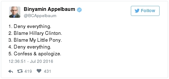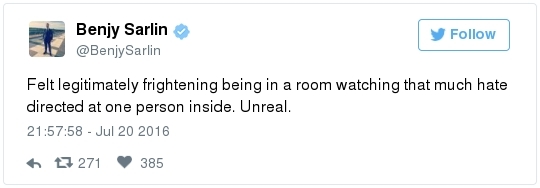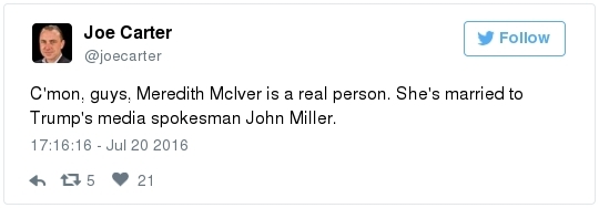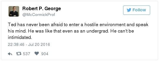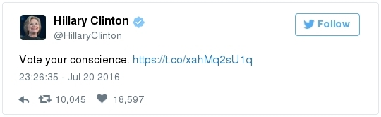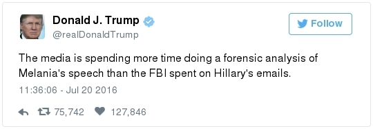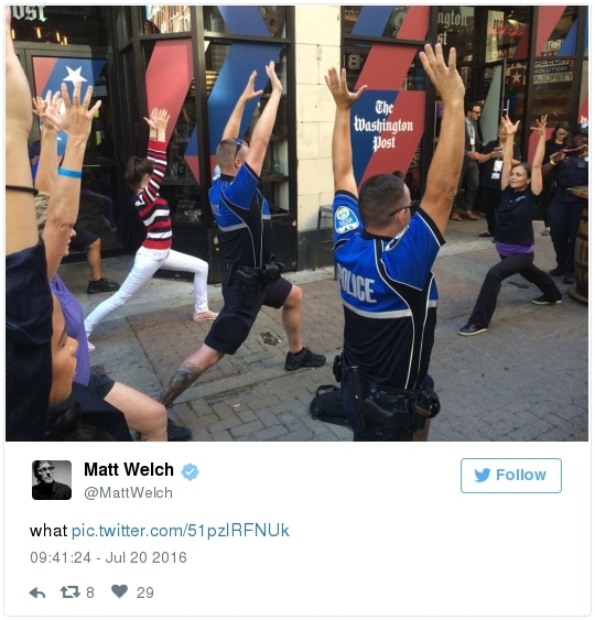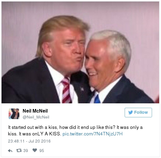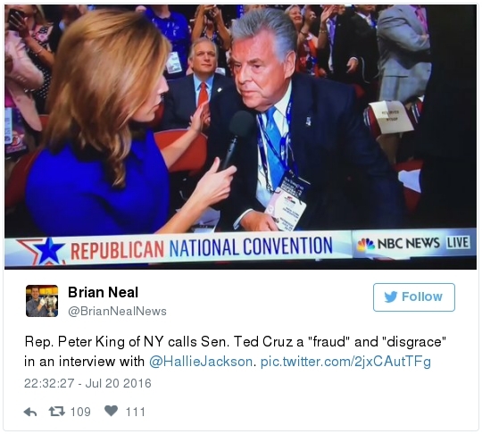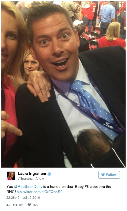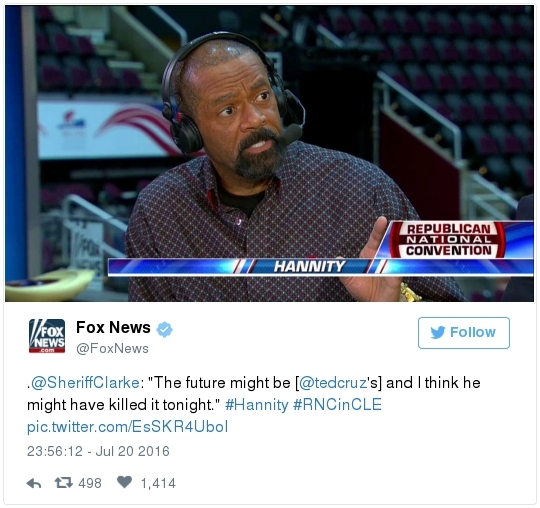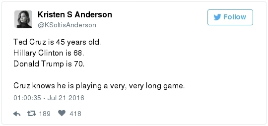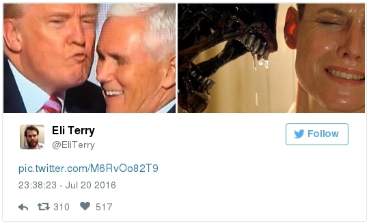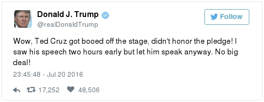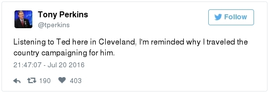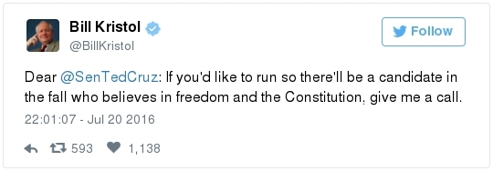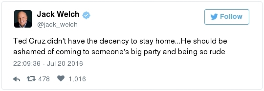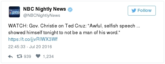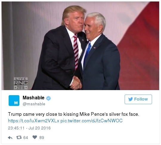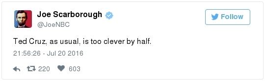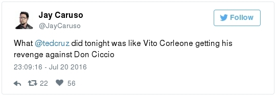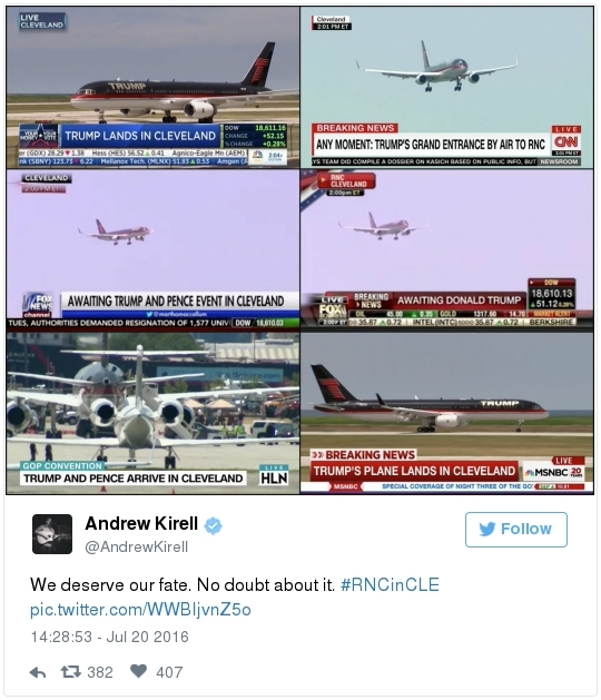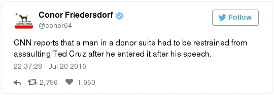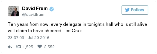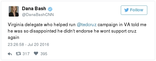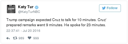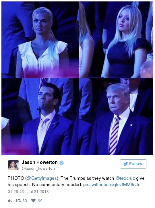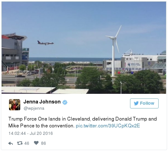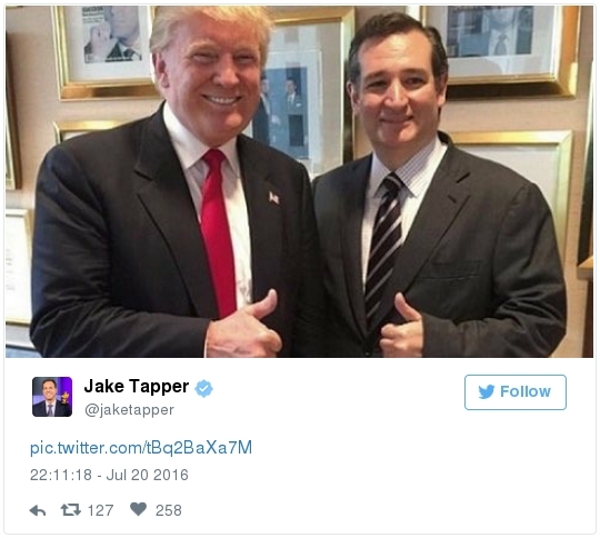 SOCIAL MEDIA SPEED READ: — ZIGNAL VISUAL: Our analytics partners at Zignal Labs confirm that Cruz totally overshadowed Pence. Overall, social media attention continued its steady decline since the start of this convention. On Wednesday, Zignal tracked just 1.1 million mentions of the RNC across all forms of media. That's lower than Tuesday's traffic, which was lower than Monday. Here are the top Cruz-related Tweets of the night, including two from the senator himself:  Here's the emoji cloud for the night's coverage:  The Clinton campaign had a field day with Cruz's speech: The biggest moment on Twitter related to Pence's speech came at the end, when Trump awkwardly came on stage: Here are two funny reactions, flagged by Aaron Blake: Watch Trump Force One land in Cleveland: A pattern on display this week? Twitter users wondered if Meredith McIver was real: This old tweet from Donald Trump, Jr. is going viral: This one also got recirculated ahead of Cruz's speech: An unexpected scene outside the Washignton Post headquarters in Cleveland: A few shots of Trump mania and protests: Third Eye Blind trolled the GOP by bashing the party platform at a convention event. A fan tweeted this at the band: This is how the guys responded: Rep. Sean Duffy (R-Wis.) carried his youngest on the convention floor: Far away from Cleveland, Ben Rhodes met with Aung San Suu Kyi: Samatha Power remembered murdered Belarusian journalist Pavel Sheremet: Rep. Michelle Lujan Grisham (D-N.M.) is hanging out on the Rio Grande: FOUR CONSERVATIVE COLUMNISTS WEIGH IN ON THE GOP'S POST-TRUMP FUTURE: -- "Will Texas become another brick in the Democrats' blue wall?," by George F. Will: "Although Steve Munisteri calls himself 'the eternal optimist,' he respects reality, which nowadays is not conducive to conservatives' cheerfulness. The former state Republican Party leader now believes Texas can 'turn Democratic sooner than most people thought.' In 2000, Republican candidates at the top of the state ticket averaged 60 percent of the vote. By 2008, they dropped to less than 53 percent. And Texas has four of the nation's 11 largest cities — Houston, San Antonio, Dallas and Austin, where Republicans are performing the worst. … The 'blue wall' — the 18 states and the District of Columbia that have voted Democratic in at least six consecutive presidential elections — today has 242 electoral votes. Texas, which is not a brick in this wall, has 38 electoral votes. After the 2020 Census, it probably will have 40, perhaps 41. Were Texas to become another blue brick, the wall — even if the 2020 Census subtracted a few electoral votes from the current 18 states — would have more than the 270 votes needed to elect a president." -- "Down with Roger Ailes and Up With Trump," by Ross Douthat in the New York Times: "Fox's populist style didn't look that much like the populism of the Goldwaterites or the religious right. But it did clearly resemble, and prepare the way for, the authoritarian and very New York populism of [Trump]. Now the populism has basically devoured, for this election season at least, the conservatism of the other Fox — the conservatism of Charles Krauthammer or George Will or Bill Kristol. And the questions facing the Republican Party after Trump are not unlike the questions facing a post-Ailes Fox, and a post-Fox Ailes. Does the Fox fusion still have a future? Will the Murdoch heirs try to gradually de-Hannitize? Could a Trump Network (with a vengeful Ailes as its impresario) rise to claim the populist audience? No matter what, the revolutions will be televised." -- "The Trump Dynasty Takes Over the GOP," by National Review Editor Rich Lowry: "Watching the GOP convention, you could be forgiven for believing that the brightest stars in the Republican firmament are all Trumps. The Trump phenomenon began, in part, as a revolt against a dynasty (the Bushes) and here we are celebrating a cult of personality with the family in the starring role (and one of the patriarch's sons, Donald Jr., already marked out for a future political career). All that said, the convention will almost certainly help Trump. If nothing else, the fanfare of officially bestowing the party's nomination on him will further legitimize his candidacy for voters." -- "The movement isn't dead. In fact, it just became even more vital," by NRO's David French (who considered an independent presidential bid): "Every four years, Americans are tempted toward myopia. Each election is the 'most important election' in our lifetimes … There is no doubt that its members failed in one of their aims — denying Trump the GOP nomination — but Never Trump was only partially about this election. The conservative movement is invested in the long game — our own 'long march' through American cultural institutions. It is not worth throwing away years of influence for the sake of four months of intraparty peace. When Trump crashes and burns — and he will, either on the trail or in the Oval Office — Americans won't look to his partisans and defenders to rebuild from the wreckage. They'll seek other voices. For the sake of the nation, it's vital that those other voices are both conservative and untainted by alliance or association with the newly minted Republican nominee." | HOT ON THE LEFT: "Backlash, apology after candidate calls judge '800-lb Silverback Alpha Male,'" from Michigan Live: "A judicial candidate felt a public backlash last week after spreading around an email criticizing a sitting judge in less-than-flattering terms. Muskegon lawyer Eric C. Grimm is one of five candidates running for a judicial position in Muskegon County's probate court. On July 10, he sent out an email to dozens of friends and colleagues asking for votes, and criticizing Muskegon County Probate Court Judge Gregory C. Pittman as a bully. 'I can understand why some of the other candidates may not want to speak up about the 800-lb Silverback Alpha Male in the middle of the P