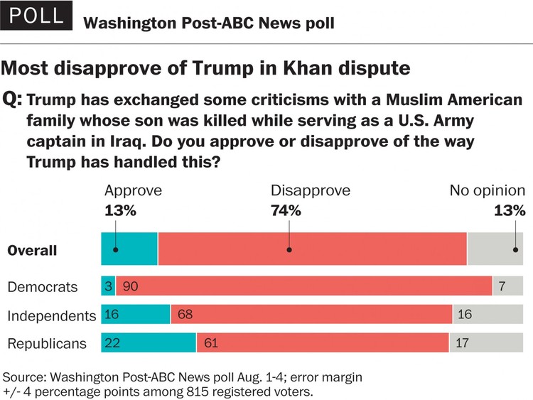 Donald Trump speaks Saturday night during a campaign rally at Windham High School in New Hampshire. (Evan Vucci/AP) THE BIG IDEA: Perceptions of Donald Trump have basically hardened and appear increasingly baked into the cake. After one of the worst weeks of his campaign, the Republican nominee only trails Hillary Clinton by 8 points in the new Washington Post/ABC News poll of registered voters. Last month -- before both conventions, before he picked an unwinnable fight with Gold Star parents and before he spent days pointedly refusing to endorse a trio of top Republicans – Trump trailed by 4 points. (The margin of sampling error happens to be, plus or minus, 4 percent.) Three in four registered voters disapproved of how the billionaire handled criticism from Khizr and Ghazala Khan. Just 13 percent approved of his back-and-forth with the Muslim American couple whose Army captain son was killed in Iraq.  This is about as one-sided as any assessment can get for a major-party candidate's actions so close to a general election. Yet Trump still gets 42 percent to Clinton's 50 percent in the horse race. -- They don't generate buzzy headlines, but sometimes the most interesting numbers in a poll are the ones that do not change from one month to the next. Our poll found only a slight rise since July in the share of voters saying Trump is biased against women and minorities (56 percent now, 53 percent last month). There was also little change in the share of voters who said Trump does not show enough respect for people he disagrees with (77 percent now vs. 74 percent back in May). "The lack of big change on these measures suggests these views of Trump are sturdy," pollster Scott Clement explains. "The unpopular debate with the Khans did not surprise people who already saw Trump as disrespectful, nor did it change the views of many Trump supporters, even those who disapproved of his handling of the issue." Trump's image is basically unchanged from a month ago. He's viewed favorably by 36 percent and unfavorably by 61 percent. Fifty-eight percent say Trump is not qualified to be president and 68 percent say the idea of Trump as president makes them anxious. Both numbers are identical to last month. A Morning Consult poll, also published Sunday, put Clinton up 9 points (46-37), a six-point movement in her direction from one week before. It was driven largely by independents defecting from Trump. Remarkably, though, Trump led 48 percent to 36 percent among voters who live in military households. A significant majority said they have been following the Khan donnybrook closely, but that 12-point advantage is statistically unchanged from before the conventions. -- The durability in these indicators – considering the news and the degree to which it has broken through – suggests that Trump will garner at least 40 percent of the national popular vote in November and probably a couple of points more. For context, Mitt Romney got an ironic 47 percent. (This does not preclude a much more lopsided result in the Electoral College.)  Mitt Romney accepts Donald Trump's endorsement at the Trump Hotel in Las Vegas in February 2012. (Steve Marcus/Reuters) Watching the coverage from afar during my vacation last week, it became abundantly clear that many pundits and media outlets have lost sight of key fundamentals. A widely-cited Marist/McClatchy poll, which had Clinton up 15 points, found Trump's getting only 33 percent of the vote. To borrow a Romney-ism, I would bet $10,000 that Trump will receive more than 33 percent of the vote 92 days from now. Here's why: -- There is no real evidence that Republicans in the general public are defecting en masse. Under pressure from his advisers and Reince Priebus, Trump relented and reluctantly endorsed Paul Ryan during a Friday night rally in Wisconsin, along with John McCain and New Hampshire Sen. Kelly Ayotte. (The Speaker is expected to romp in his primary tomorrow, but challenger Paul Nehlen is an outspoken booster of The Donald.) The Post/ABC poll finds 83 percent of self-identified Republicans support Trump, unchanged from early July. Clinton, meanwhile, gets 92 percent among self-identified Democrats, up from 86 percent before the Democratic National Convention. Democrats are pushing the narrative that she's making significant inroads with GOP partisans. Perhaps she will eventually, as the rank-and-file react to signals transmitted by party elites, but right now it's relatively small.  Hillary Clinton addresses the National Association of Black Journalists and the National Association of Hispanic Journalists on Friday. (Win McNamee/Getty Images) -- Clinton, like Trump, is historically unpopular. The Democratic nominee's favorability improved in the wake of her coronation in Philadelphia. She's now viewed favorably by 46 percent of registered voters, up from 40 percent last month. But 52 percent still view her unfavorably. And most of those view her very unfavorably. Six in 10 registered voters say Clinton is not honest and trustworthy, and 65 percent say she's too willing to bend the rules. Most Republicans loathe Clinton. Six in 10 GOP voters in our poll say they are dissatisfied with their choices, and 56 percent of Trump's supporters say they support him primarily because they oppose Clinton. Like many of the metrics mentioned above, this is unchanged from last month. (On the other side, half of Clinton's voters say they are supporting her mainly to oppose Trump.) -- The long-term trend of rising negative partisanship makes it nearly impossible for Clinton to win in a landslide. Partisans view the opposite party more negatively than they used to. These feelings have become dramatically more intense since 1980 and an increasingly large driver of the vote. (For the data backing this up, read this June 2015 article from Emory University's Alan Abramowitz.) This helps explain why popular vote blowouts have become less common during the post-World War II era. Barry