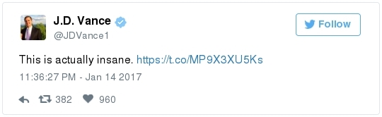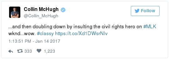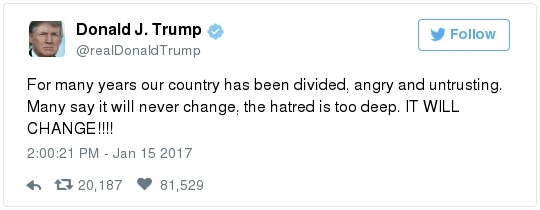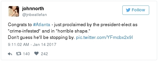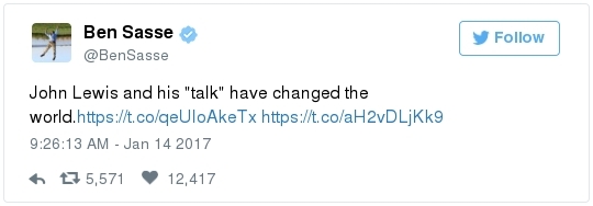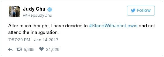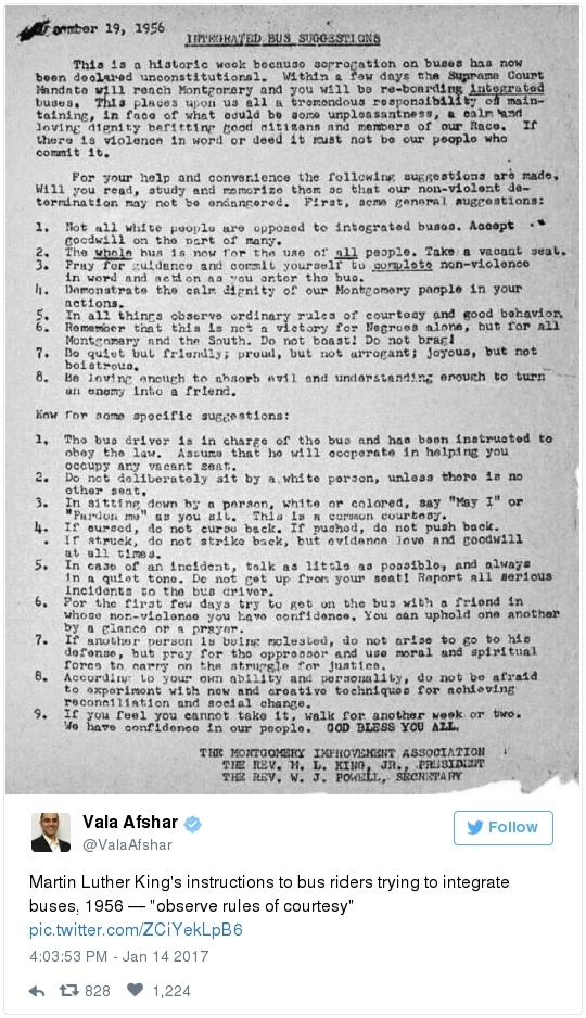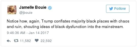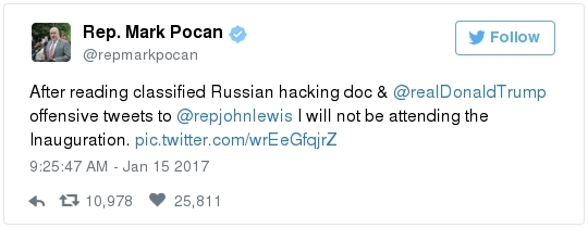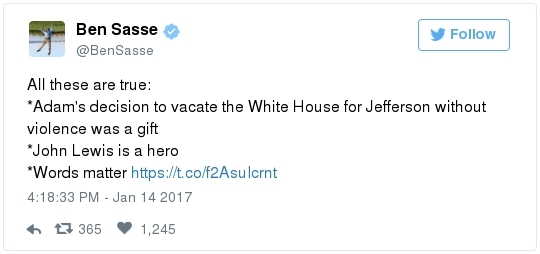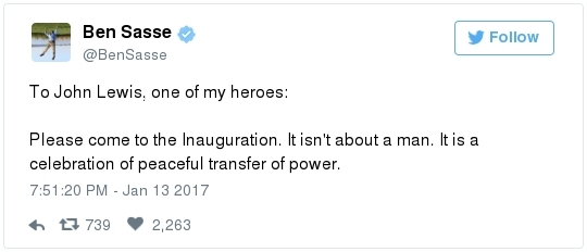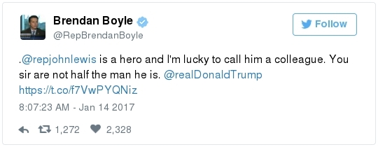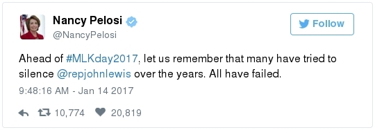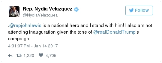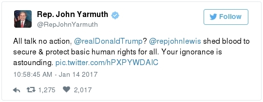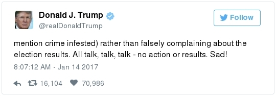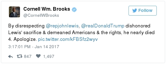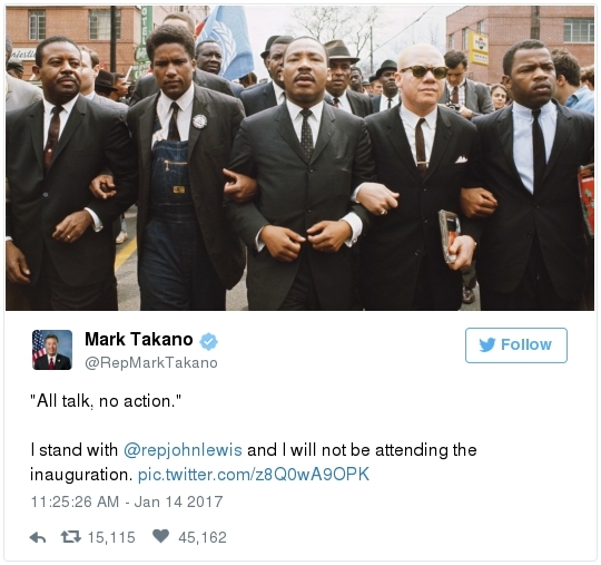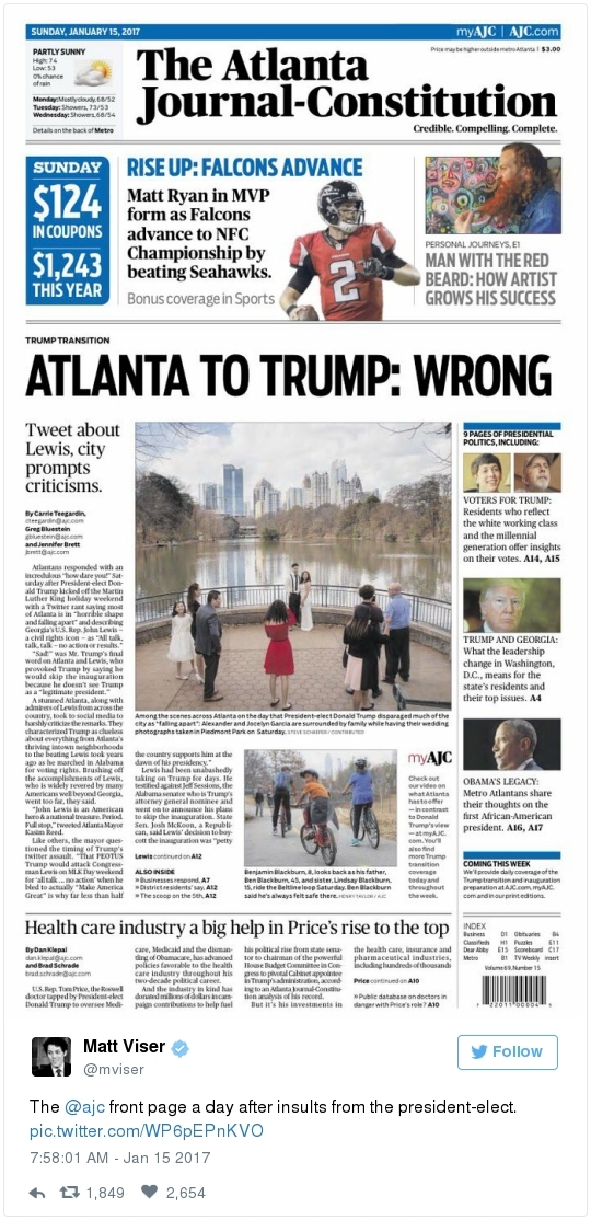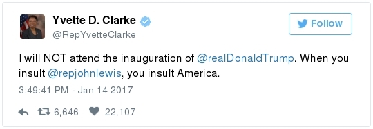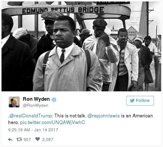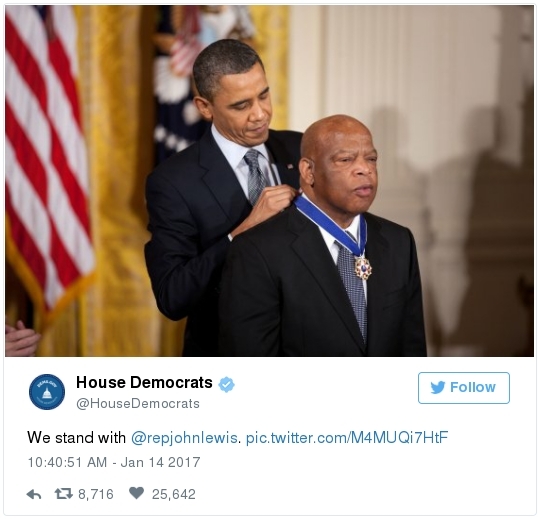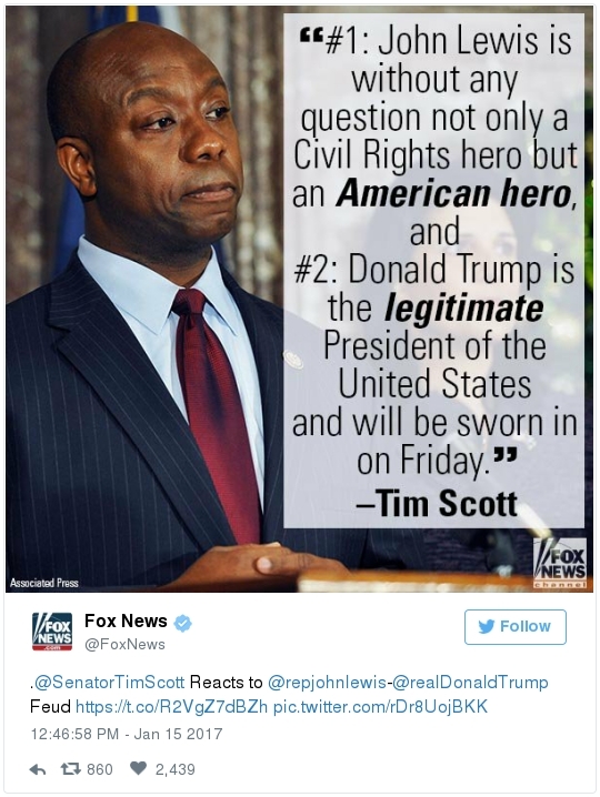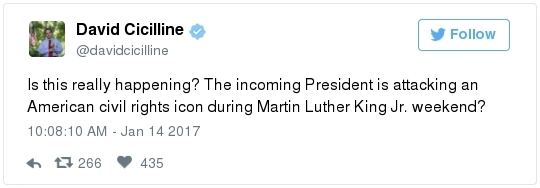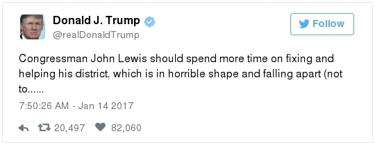 -- Other stories you might recall since the election: Carl Paladino, the former Republican nominee for governor of New York, included the death of President Obama and the "return" of first lady Michelle Obama to Africa on his list of things he wanted for 2017. He wrote that he would like to see FLOTUS "return to being male" and be "let loose" in Zimbabwe. The director of a government-funded nonprofit in West Virginia celebrated the idea of Melania Trump replacing Mrs. Obama, as well. "It will be so refreshing to have a classy, beautiful, dignified First Lady back in the White House," she wrote on Facebook. "I'm tired of seeing a (sic) Ape in heels." -- The Fourth Circuit lamented last summer how North Carolina's legislature "targeted African Americans with almost surgical precision." Lawmakers literally requested data on racial differences in voter behavior and then made the only acceptable forms of voter identification the ones that they knew were disproportionately used by white people. There's not always a smoking gun like that. De facto racism, less blatant but just as corrosive, continues to systemically suppress millions of African Americans, preventing them from being able to participate in society on a level playing field. Drug sentencing laws, education funding formulas and a host of other public policies each perpetuate racial inequality. Not to mention, the soft bigotry of low expectations endures.  | | Seven reactions to Donald Trump's feud with John Lewis | -- Trump's Martin Luther King Jr. weekend tweets demonstrated anew that he clings to outdated stereotypes of the black community. Trump assumed that John Lewis's constituents are impoverished and struggling. In fact, the congressman's district includes some of the choicest parts of metro Atlanta, including Buckhead and Emory University. During the campaign, he often spoke as if all African Americans live in struggling "inner-cities." "What do you have to lose?" he asked the community rhetorically during rallies, though he was speaking to overwhelmingly white crowds. (Our Simone Sebastain tabulated that more than half of the country's black residents do not live in urban areas. "Using 'inner city' as a stand-in for 'black' is even less accurate than using 'suburban' as a stand-in for 'white,'" she wrote.) After the election, Trump publicly celebrated low black voter turnout. "The African American community was great to us," he said during a stop on his "Thank You Tour" in Michigan. "They came through big league. And frankly, if they had any doubt, they didn't vote. And that was almost as good. Because a bunch of people didn't show up." (He received 8 percent of the African American vote, according to exit polls.) -- Michael Gerson, the former chief speechwriter for George W. Bush, calls Trump's attack on Lewis "the essence of narcissism" in his column today: "Trump seems to have no feel for, no interest in, the American story he is about to enter. He will lead a nation that accommodated a cruel exception to its founding creed; that bled and nearly died to recover its ideals; and that was only fully redeemed by the courage and moral clarity of the very people it had oppressed. People like the Rev. Martin Luther King Jr. People like John Lewis. … Were John Lewis to call me every name in the book, I would still honor him." -- The latest episode dovetails with a decades-long pattern for Trump. The Justice Department sued him and his father in 1973 for discriminating against African Americans who wanted to rent in their buildings. Eventually the Trumps settled, but DOJ had to take them to court again in 1978, alleging that they had reneged on the agreement. Then a decade later Trump took out a full-page ad in New York newspapers urging the death penalty for five black and Hispanic teenagers accused of raping a woman in Central Park. The young men were exonerated, but Trump criticized the city for awarding them damages for the years they had been wrongly imprisoned.  DJT poses with Kanye West in the lobby of Trump Tower last month. (Andrew Kelly/Reuters) -- To be sure, Trump makes plenty of time for photo ops. From Janell Ross and Vanessa Williams: "During the transition, Trump has been frequently photographed with black celebrities at his New York headquarters, including the rapper Kanye West, retired football great Ray Lewis and boxing promoter Don King. On Friday, he was visited by Steve Harvey, a comedian, game-show host and dating-advice guru. … D.L. Hughley, a comedian and political commentator, blasted Trump for 'having a comedian and a rapper and a football player out to talk about the concerns of the community.' 'If Donald Trump cared about black people, he wouldn't have denigrated the president with those claims of birtherism,' he said. 'You'd rather see us run the football than run the country.'" -- Two dozen Democratic lawmakers, including at least nine African Americans, have now said they will boycott Trump's inauguration. That number is expected to grow because of the continuing fallout of the president-elect's attacks on Lewis. Among them is John Conyers Jr., the dean of the House, and Barbara Lee of California. "Donald Trump has proven that his administration will normalize the most extreme fringes of the Republican Party," Lee said in a statement. "On Inauguration Day, I will not be celebrating. I will be organizing and preparing for resistance."  Charles Person, one of the original 13 Freedom Riders in 1961, poses for a portrait outside his Atlanta home. "I was too young to be scared," says Person, who 18 then. (Kevin D. Liles/For the Washington Post) -- A good oral history for MLK Day --> "'We were soldiers': The flesh and blood behind the new civil rights monument,'" by Rhonda Colvin: "Charles Person took a beating when he was 18 in Anniston, Ala., the youngest of the Freedom Riders for civil rights in 1961. He took a blow to the head a few days later in Birmingham. The buses finally were integrated, lif