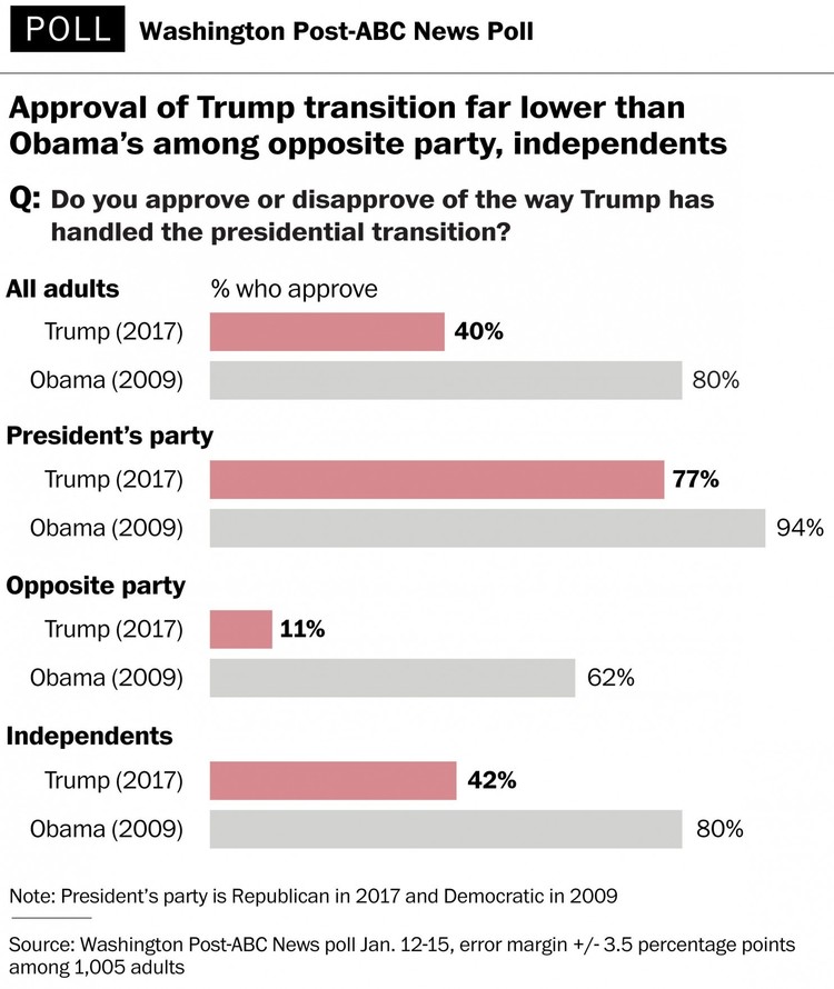 - When asked generally about their faith in his decision making, just under four in 10 say they have either a "great deal" or a "good amount" of confidence in Trump, while about 6 six in 10 say they have "just some" or "none at all." That is the mirror opposite of attitudes eight years ago on the eve of Obama's first inauguration.
