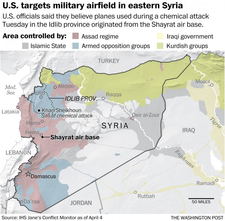 "Trump abruptly sheds his noninterventionist façade" is how Aaron Blake wrote up last night's news. "It's likely that the noninterventionist promises Trump made during the campaign helped him by allaying some of the greatest fears about making him president and commander in chief. Arguably his biggest liability was that people — even many supporters — believed he lacked the proper temperament to be president. The prospect of the hotheaded, itchy-Twitter-fingered reality TV star having access to the nuclear codes was an attack ad that wrote itself. But Trump's promises to stay out of the Middle East and focus on the homeland mitigated that line of attack. Voters were led to believe his foreign policy wouldn't be on the same hair trigger that everything else about him seemed to be, and it gave them license to instead focus on what a businessman president could do for the economy. Yet here we are. Less than three months into his presidency, Trump has now responded to a not-unprecedented set of circumstances in Syria with an unprecedented degree of force and provocation."