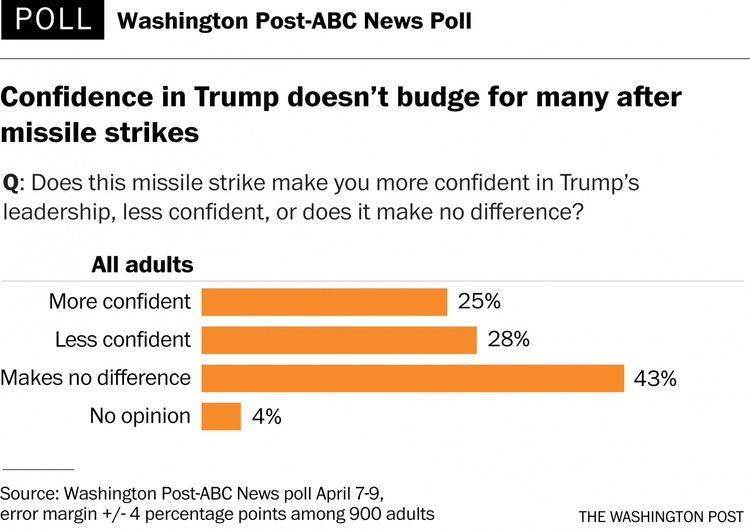 President Trump walks the grounds of the White House yesterday. (Jabin Botsford/The Washington Post)  | | | BY JAMES HOHMANN | | with Breanne Deppisch | | | THE BIG IDEA: More Americans than ever view the news through red-colored glasses. In 2013, when Barack Obama was president, a Washington Post-ABC News poll found that only 22 percent of Republicans supported the U.S. launching missile strikes against Syria in response to Bashar al-Assad using chemical weapons against civilians. A new Post-ABC poll finds that 86 percent of Republicans support Donald Trump's decision to launch strikes on Syria for the same reason. Only 11 percent are opposed. -- Overall, a bare 51 percent majority of U.S. adults support the president's action in our new poll. In 2013, just 30 percent supported strikes. That swing is driven primarily by GOP partisans. For context, 37 percent of Democrats back Trump's missile strikes. In 2013, 38 percent of Democrats supported Obama's plan. That is well within the margin of error. Independents are split evenly, with 46 percent backing Trump's decision and 45 percent opposing it. -- Trump's decision has had no impact on confidence in his leadership. A plurality say last week's action doesn't make a difference in their views of him:  These numbers break down along partisan lines, as well: 54 percent of Republicans say the strikes make them more confident in Trump, while just 23 percent of independents and 10 percent of Democrats do. -- The electorate's view is somewhat nuanced: - There is not much confidence that firing 59 Tomahawks at one base will make much of a difference, even as a deterrent. "Nearly 7 in 10 say they are 'not so' or 'not at all' confident the U.S. missile strike will end the Syrian government's use of chemical weapons, while one-quarter are at least somewhat confident," pollster Scott Clement notes.