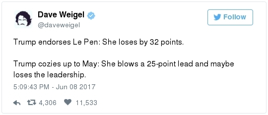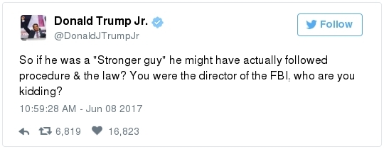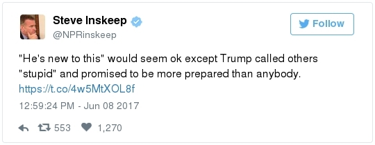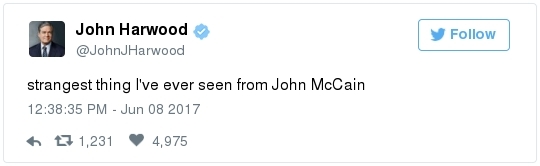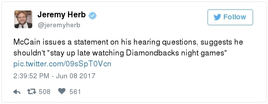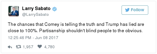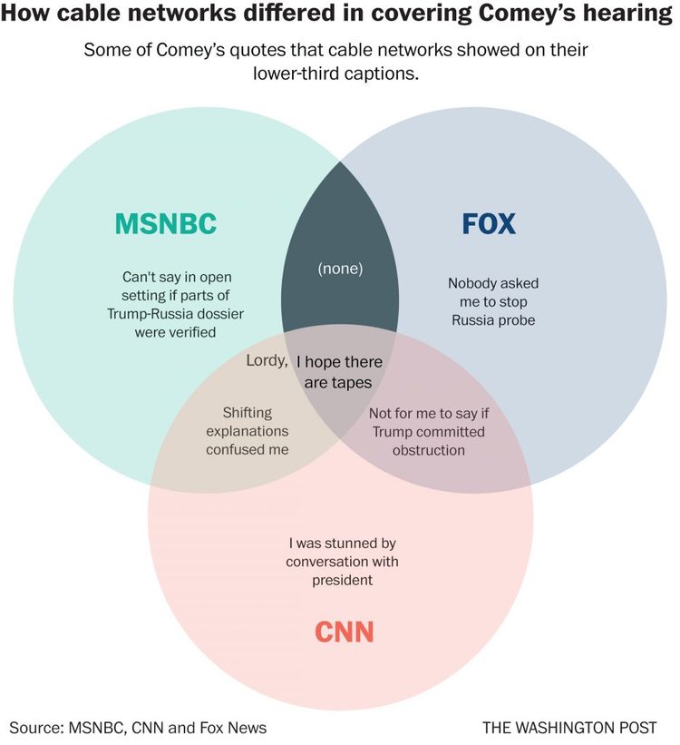 James Comey swears to tell the truth before the Senate Intelligence Committee yesterday. (Melina Mara/The Washington Post)  | | | BY JAMES HOHMANN | | with Breanne Deppisch | | | With Joanie Greve THE BIG IDEA: A Washington Post/ABC News poll in late April found that 81 percent of Republicans think President Trump is honest and trustworthy – compared to 38 percent of Americans overall and 34 percent of independents. In the spring of 2016, not long before he secured the GOP nomination, just 46 percent of self-identified Republicans said Trump is honest and trustworthy. Immediately after the convention in Cleveland, that popped to 69 percent and continued to rise after his November victory. Besides becoming their party's standard bearer, what specifically has Trump done in the past 15 months to persuade one in three Republicans who thought he was dishonest that he can now be trusted? The knee-jerk reaction to James Comey's very credible and very serious allegations yesterday, which the former FBI director made under oath and has contemporaneous notes to back up, is the strongest proof point yet of the rising tribalism that has infected our politics. We saw a similar dynamic two weeks ago when many GOP apparatchiks rallied to the defense of Montana congressional candidate Greg Gianforte after he physically assaulted a reporter. And it has not stopped at the water's edge. When Barack Obama was president, a Post-ABC poll found that only 22 percent of Republicans supported missile strikes against Syria in response to Bashar al-Assad using chemical weapons against civilians. After Trump did it, 86 percent of Republicans supported strikes for the exact same reason. It's easy to forget amidst the donnybrook, but Comey has been a card-carrying Republican virtually all of his life. George W. Bush appointed him as a U.S. attorney and, later, deputy attorney general. He was a hero on the right when he rebuked Hillary Clinton as "extremely careless" last summer, but attitudes have shifted now that he's going after Trump. A Post-ABC poll conducted this week found that just 27 percent of Americans believe Trump fired Comey "for the good of the country." But 71 percent of Republicans did. We'll know soon if the hearing moves the numbers, but don't hold your breath. Joe Heim interviewed a couple from Florida watching in the bar at Trump's D.C. hotel. "I'm sticking by his side to the end," said Scott Cowpland, 61. "If he wants loyalty, he's got our loyalty," added Ann Mytnik, 56.  | | James Comey's testimony, in 3 minutes | -- Trump this morning reacted to Comey's testimony by calling him a liar: -- Sometimes it feels like the president's M.O. is: I know what you are, but what am I? When someone attacks him for something, he quite often lobs the same charge right back at who he perceives to be the accuser. Recall how Trump started talking about Bill Clinton's infidelity last October after he got caught on tape boasting about being able to get away with groping women because he's a celebrity. Then he appropriated the term "fake news" after the election. -- Comey – fired one month ago today – repeatedly called the president a liar as he fielded questions for more than 2 ½ hours from senators on the Intelligence Committee. - On why he agreed to testify: "The administration … chose to defame me and, more importantly, the FBI by saying that the organization was in disarray, that it was poorly led, that the workforce had lost confidence in its leader. Those were lies, plain and simple."