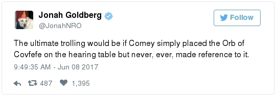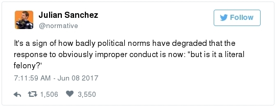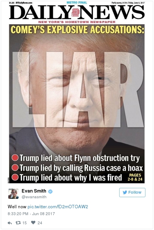 -- Before he became president, Trump himself even boasted about playing fast and loose with the truth. "The final key to the way I promote is bravado," he explained in "The Art of the Deal." "I play to people's fantasies. … A little hyperbole never hurts. People want to believe something is the biggest and the greatest and the most spectacular. I call it truthful hyperbole." HOW THE COMEY NEWS IS PLAYING: This is the cover of one of Trump's hometown newspapers: This is the cover of next week's New Yorker:  "Charlie Chaplin and Donald Trump both get caught in the grinding gears of modern times," says artist Barry Blitt. "But with Trump it's not so funny." -- "For his performance of a lifetime, [Comey] decided to play two roles at once: The prototypical G-man, always on the straight and narrow, dedicated only to truth and justice, and the aggrieved victim of an undisciplined, line-crossing president," our Marc Fisher observes in a thoughtful review. "In both roles, the play ends with Comey … in a new and uncomfortable place — as the whistleblower, warning the nation about a president who schemes, lies and seeks to corrupt public servants under the guise of loyalty... "Comey was a little bit Jimmy Stewart, sprinkling his answers with aw-shucks modesty," Marc adds. "And he was a little bit John Dean, not quite declaring a cancer on the presidency but pronouncing himself very much 'shocked and troubled' by what he perceived as Trump's repeated efforts to get him to ease off the FBI's investigation … As in the legendary 'Saturday Night Live' bit about the miracle product Shimmer, which turns out to be both a floor wax and a dessert topping, Comey decided to play both roles." -- "It has been many years since a witness appeared on Capitol Hill and put a president in such potential jeopardy," writes Dan Balz, The Post's chief correspondent, in a smart take. "The investigation is far from its conclusion and, as with so much about the probe, the evidence is murky or disputable. But for the president and his White House … this was not a good day." On the front page of the New York Times, Peter Baker calls it "the most damning j'accuse moment by a senior law enforcement official against a president in a generation." "Comey emerged as a superb institutionalist, a man who believes we are a nation of laws," adds columnist David Brooks. "Trump emerged as a tribalist and a clannist, who simply cannot understand the way modern government works."  Mark Warner confers with Richard Burr during a Wednesday Intelligence hearing. (Melina Mara/The Washington Post) WHERE DO WE GO FROM HERE? -- "This is nowhere near the end of the investigation," Intelligence Committee Chairman Richard Burr (R-N.C.) said after the hearing. -- "The most important takeaway from Comey's testimony may be what he didn't say," Eugene Robinson writes in his column. "Topics he scrupulously avoided may give a hint of where the investigation is headed. He declined, for example, to answer a question in open session about Vnesheconombank (VEB), a Russian government-owned development bank linked to President Vladimir Putin. Trump's adviser and son-in-law, Jared Kushner, met last year with VEB executives." -- The Senate Intelligence Committee expects Jared Kushner to meet with committee staffers this month, two sources familiar with the planning told NBC News last night. A third source familiar with the conversations added that discussions about timing are still ongoing. -- Members of both parties want to see copies of Comey's contemporaneous memos. -- Whether there are tapes has become more significant than ever. "I have no idea," Sarah Huckabee Sanders said during the White House briefing when asked if there are tapes. Asked to look into it, she was flip: "Sure, I'll try to look under the couches." -- If it turns out there were tapes, and Trump destroyed them, that could constitute a smoking gun of obstruction. It would also represent a tacit confession that Comey's testimony is accurate.  Jeff Sessions makes his way off stage after addressing the National Law Enforcement Conference on Human Exploitation in Atlanta this week. (Chris Aluka Berry/Reuters) JEFF SESSIONS MAY BE IN REAL TROUBLE: -- Yesterday's hearing raised a host of new questions about the sitting attorney general's truthfulness, judgement and contacts with the Russians. This was very cryptic: "Comey said that the bureau had information about Sessions — before he recused himself from overseeing the investigation into Russian meddling in the 2016 election — that would have made it 'problematic' for him to be involved in the probe," Sari Horwitz reports. "Comey would not provide details of what information the FBI had." Based on Russian-to-Russian intercepts, Comey told members of the Intelligence committee during a classified afternoon session that Sessions may have had a third unreported interaction with Sergey Kislyak, per CNN. (The AG's spokeswoman denies such an encounter, but remember that they were not forthcoming about the first two meetings...) Comey said during the open portion of the hearing that it is "a reasonable question" as to why Sessions, who has recused himself from the Russia investigation, was involved in his firing when Trump admits publicly that he acted because of the Russia investigation. The fired director also said he believes Sessions knew better than to leave him alone with Trump in the Oval Office on Feb. 14. "My sense was the attorney general knew he shouldn't be leaving, which is why he was lingering," Comey said. It was during the subsequent conversation that the president allegedly said this:  "I took it as a direction," Comey explained yesterday. "I mean, this is the president of the United States, with me alone, saying, 'I hope' this. I took it as, this is what he wants me to do." If there was nothing improper about it, Comey wondered, "Why did he kick everyone out of the Oval Office?" After that meeting, Comey said he told Sessions