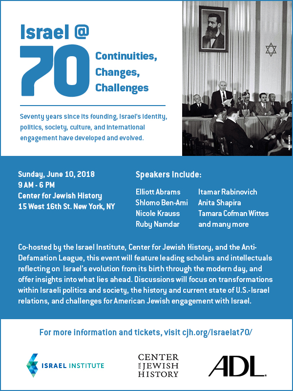 Join Shlomo Ben-Ami, Nicole Krauss, and others THIS SUNDAY to explore Israel@70 [Sponsored by the Center for Jewish History, Israel Institute, and ADL]
